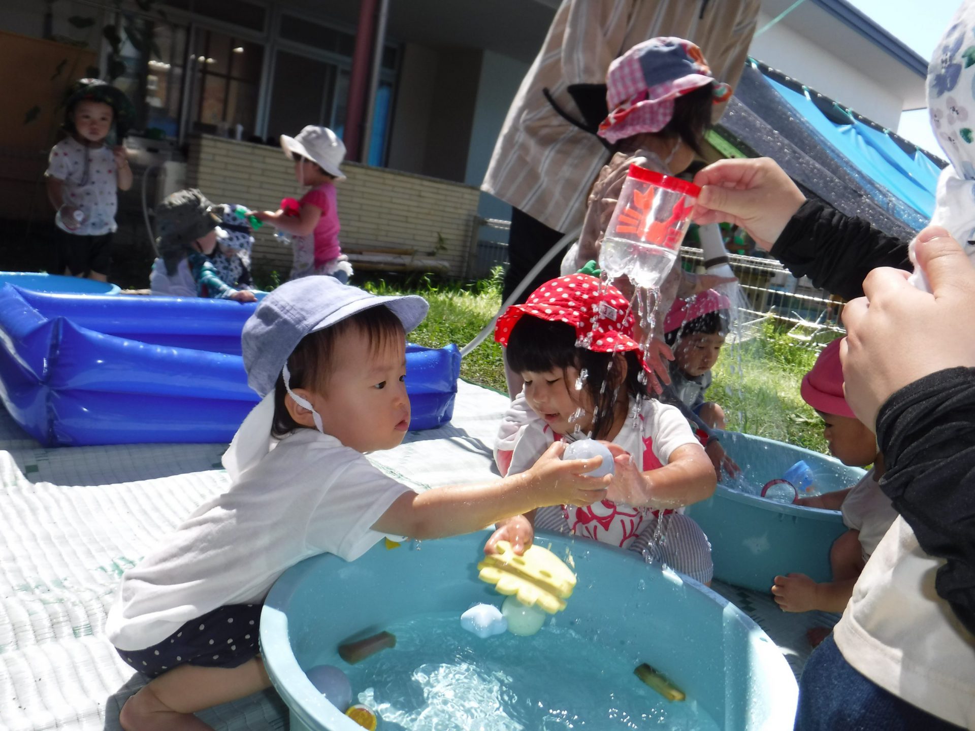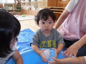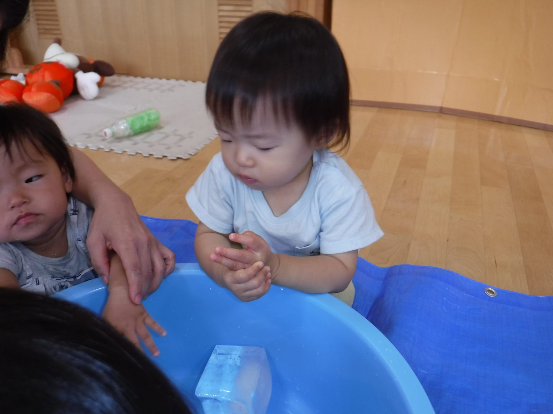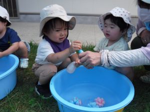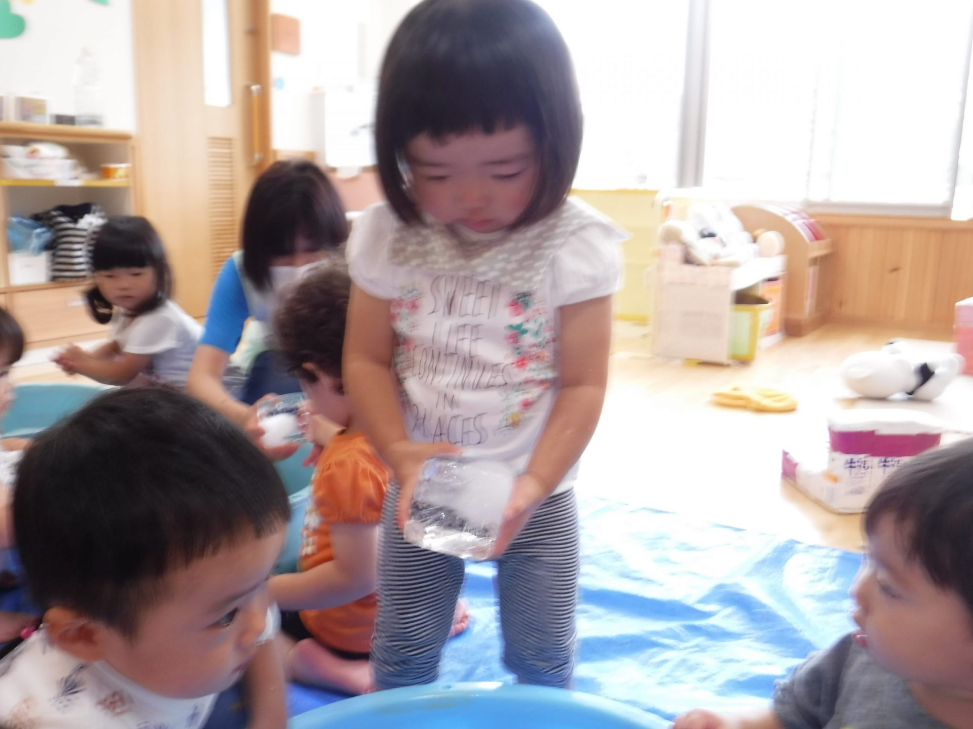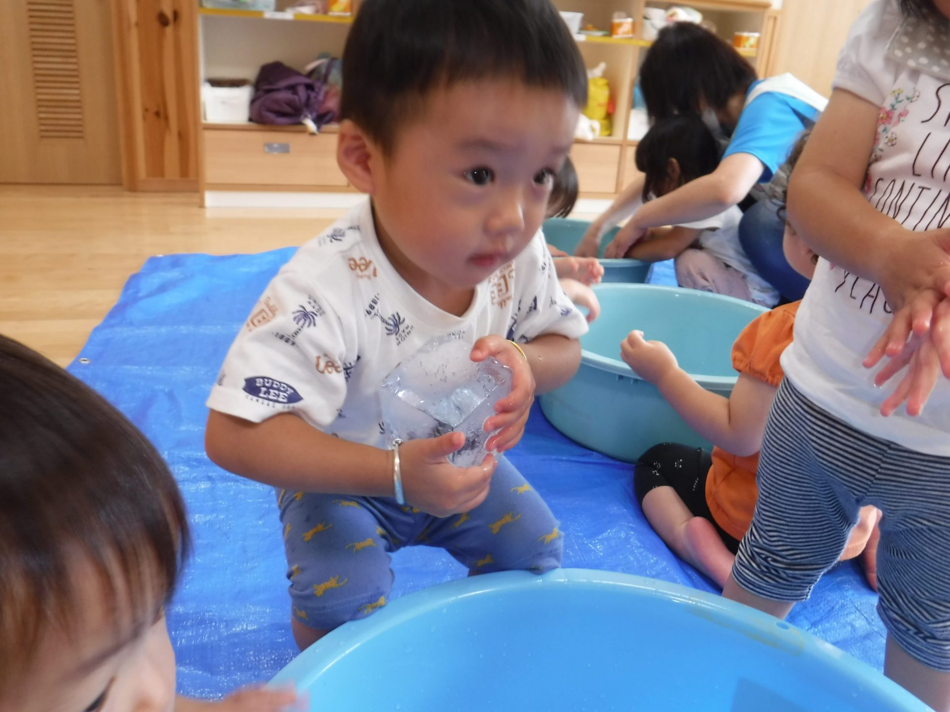 小さいお友だちは水、水風船、氷、圧縮袋に水をいれた“おみずのおふとん”など