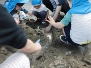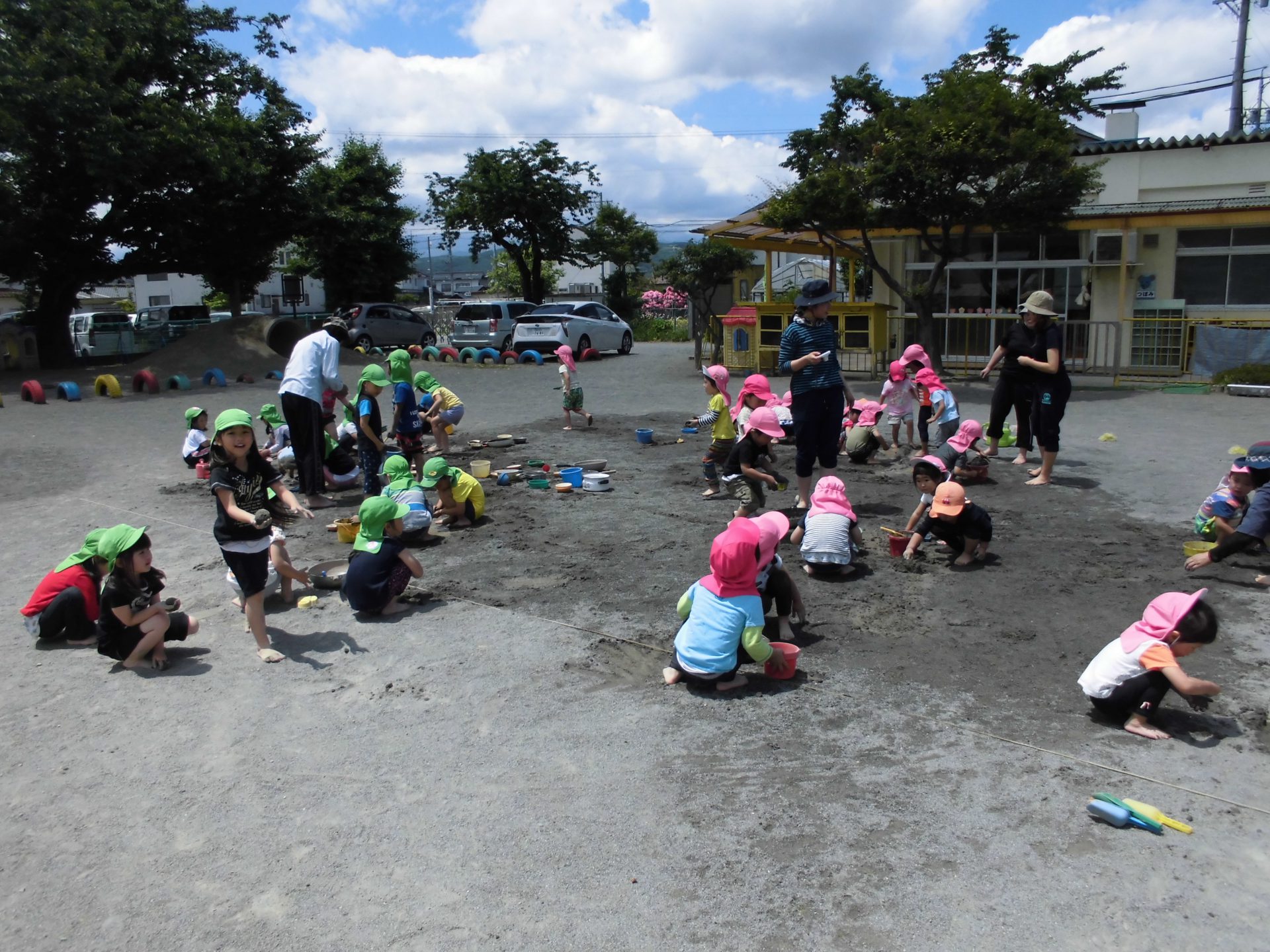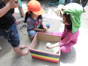 あそびの中で泥だんごつくりも伝承されているので、年齢の低い子も大きい子のやっていることを見て自然に学んでいます。まだ、うまく作れない3歳児を見て、5歳児がアドバイスしたり手伝う姿もあります。以前から取り組んでいる異年齢の活動もこんなところに、いきていることを感じます。自然の中で心を開放して十分遊びこむことが、子どもたちの未来につながっているようにも思います。