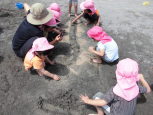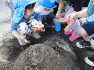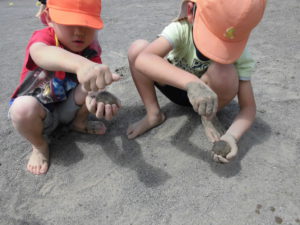 ひよこ組(2歳児)さんは、砂場へ・・。お皿に砂を入れて型抜きあそび。「砂を入れたら、トントンってすると、うまく抜けるんだって」