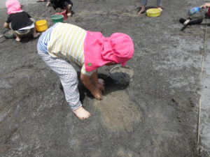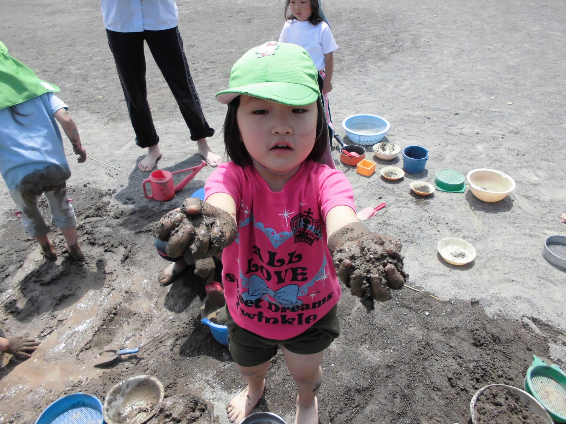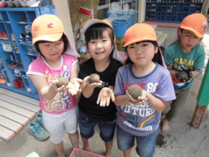 「今日は、泥で遊ぼう!泥だんごもできるよ」