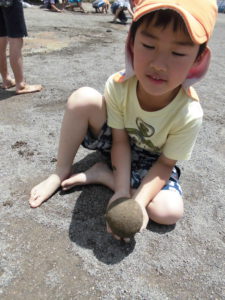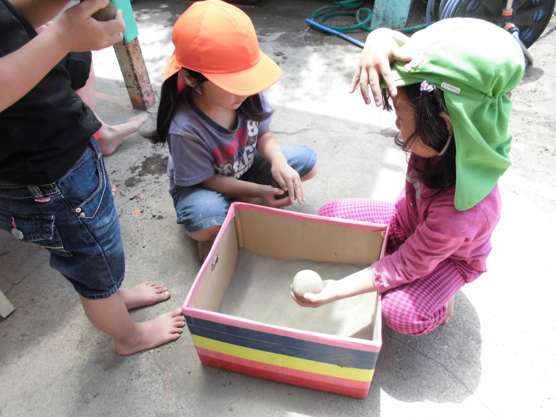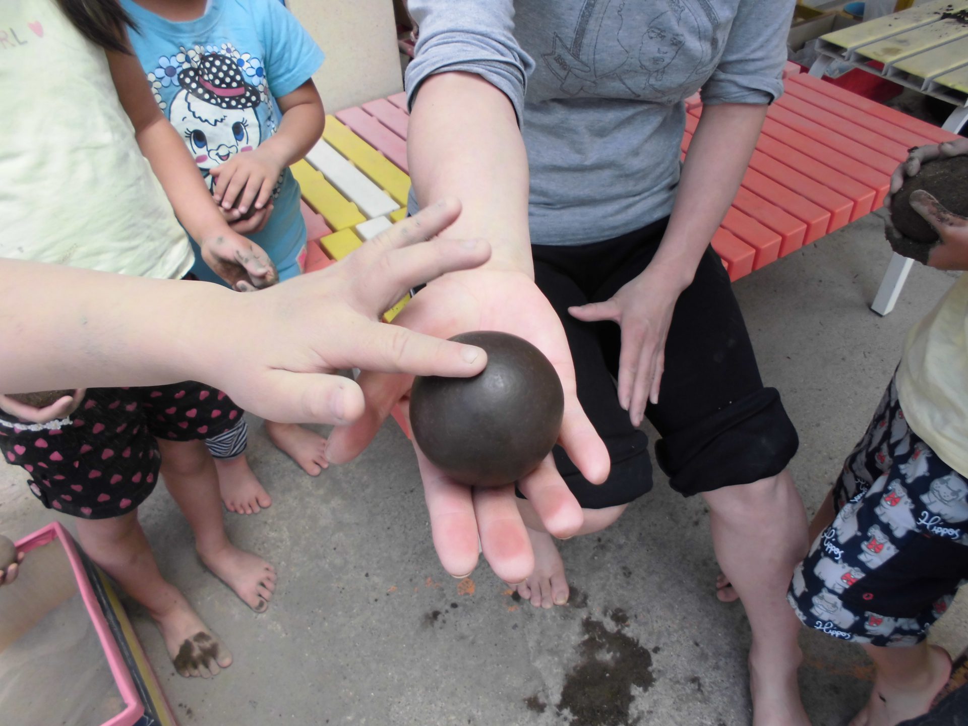 「わぁ~!先生の泥だんご、光ってる・・」「つるピカだ!」「さわらせて」