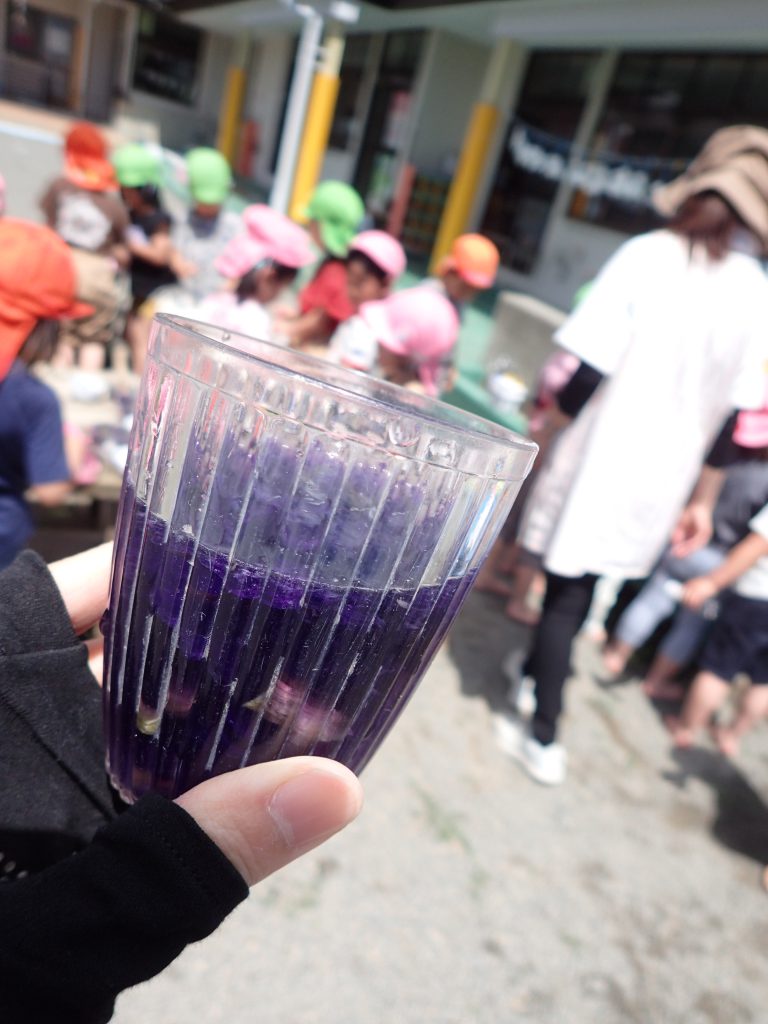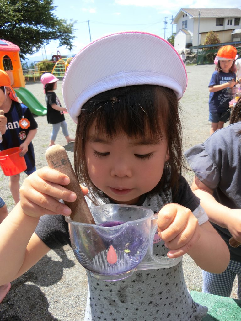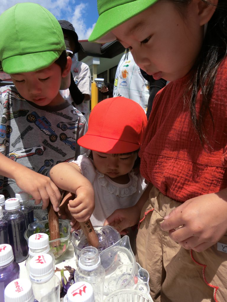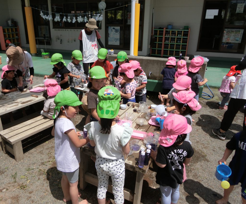 ◇異年齢交流もかねて学年の枠を超え、色水遊びをしました。