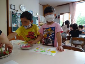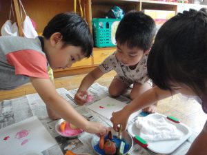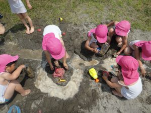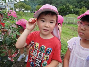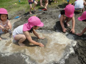 夏は植物や生き物が活発になり、子どもたちの興味、関心が高まる季節です。今回記載した遊びの姿からも、生物、水、土など自然物との触れ合い、遊びの中で、生き生きと過ごす子どもたちの姿がたくさん見られました。自然物は、形が定まらなかったり、一瞬一瞬で変化する楽しさがあるので、子どもも夢中になってそれに向かったり、様々な工夫をしたりする姿が見られ、改めて自然と触れ合う機会の大切さを感じました。子どもたちにはこれからも自然と一緒に存分に遊び、様々な発見や学びを楽しんでいってほしいです。