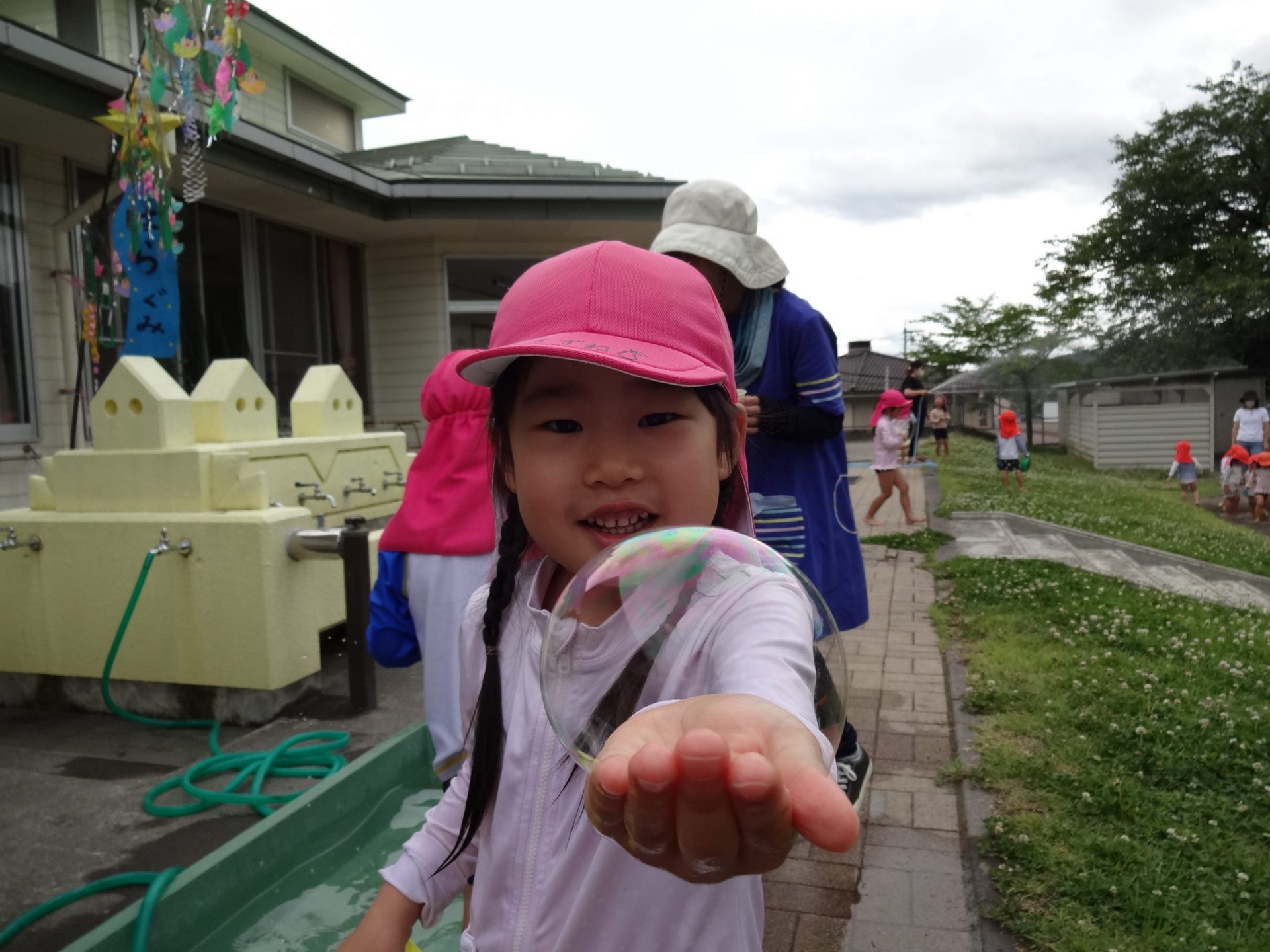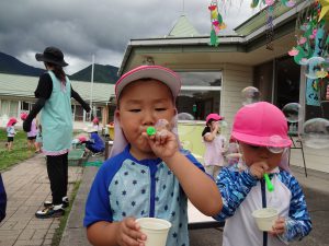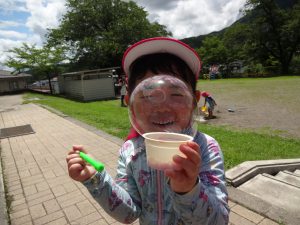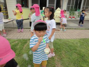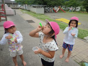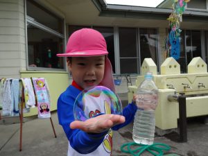いつもの砂遊びとは違った面白さがあり、砂を掘ったり水を流したり夢中になって楽しんでいます。シャボン玉も、たくさん飛ばす、大きく膨らませるところから、いろんな所にくっつけるなど工夫をしながら遊びを発見して、どんどんシャボン玉の面白さにのめり込んでいました。