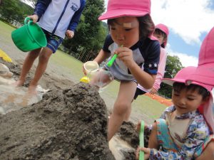 お砂遊びもいろいろ工夫。「川をつなげよう。」「水の真ん中に山をつくってみよう。」「ペットボトルの中にどろんこのお水をいれたらどうなるかな。」様々な遊びが広がるどろんこ遊びは、子どもたちが大好きな遊びの一つです。