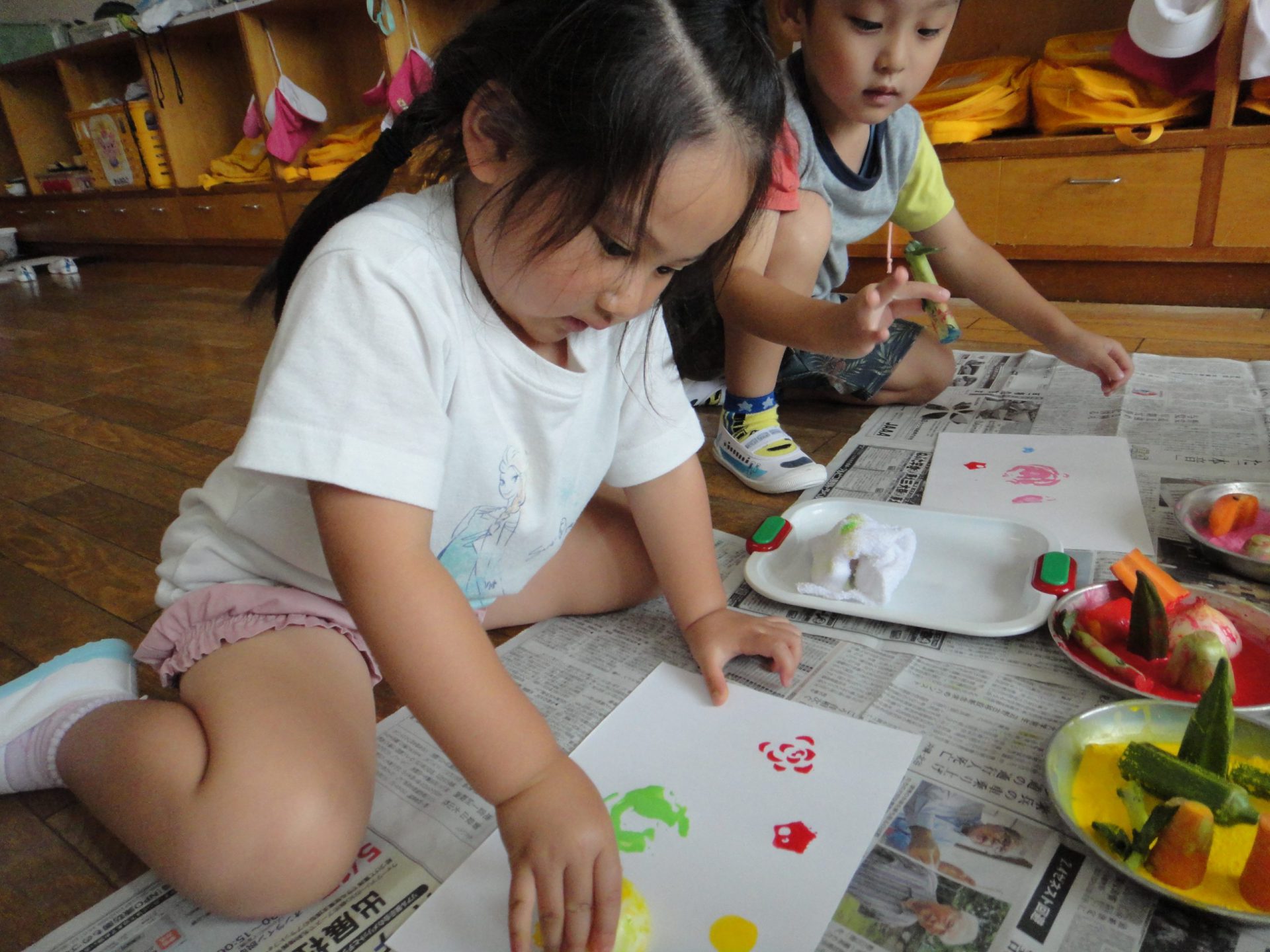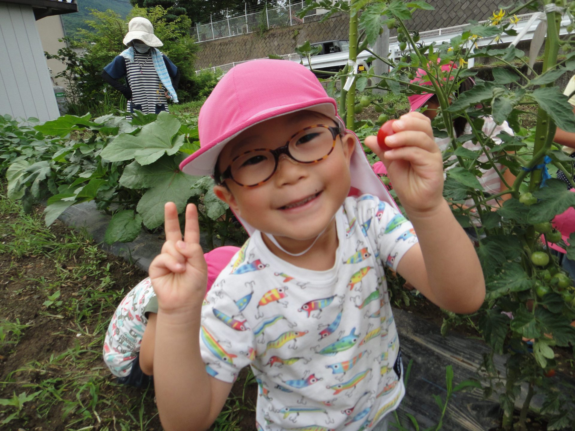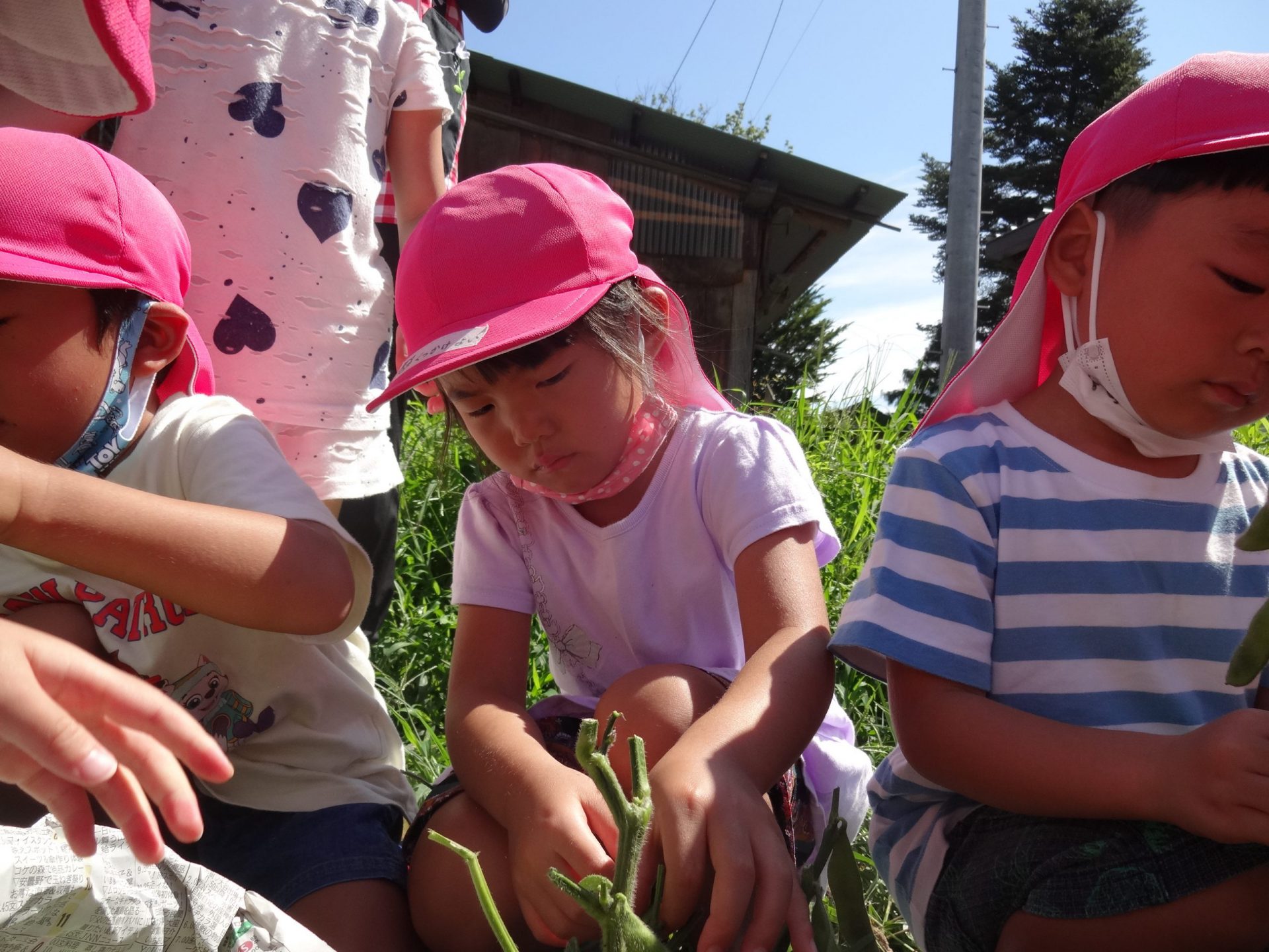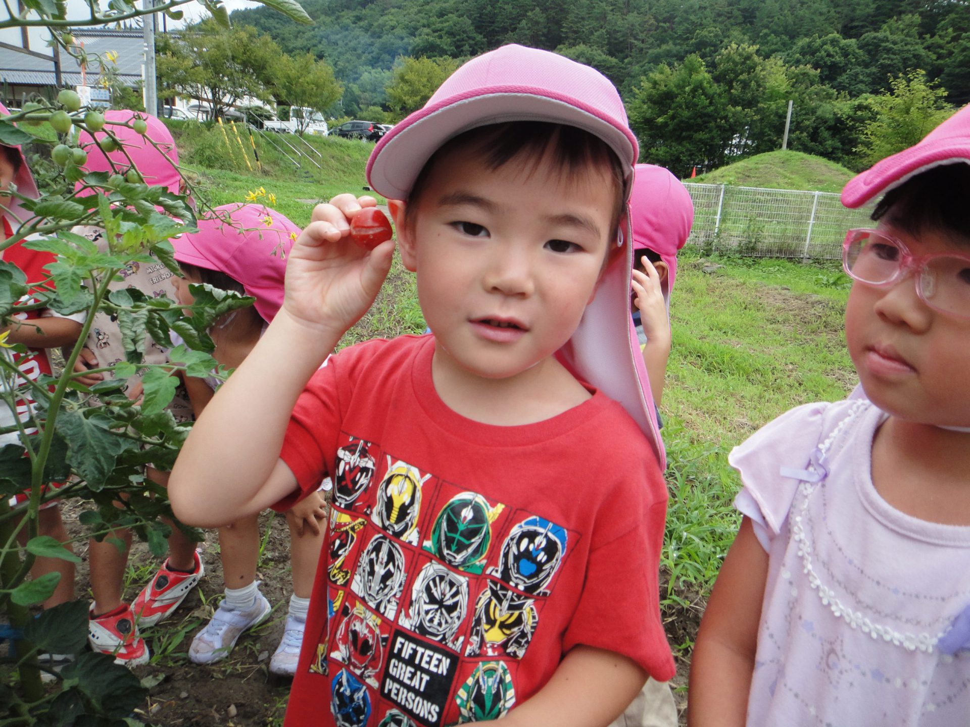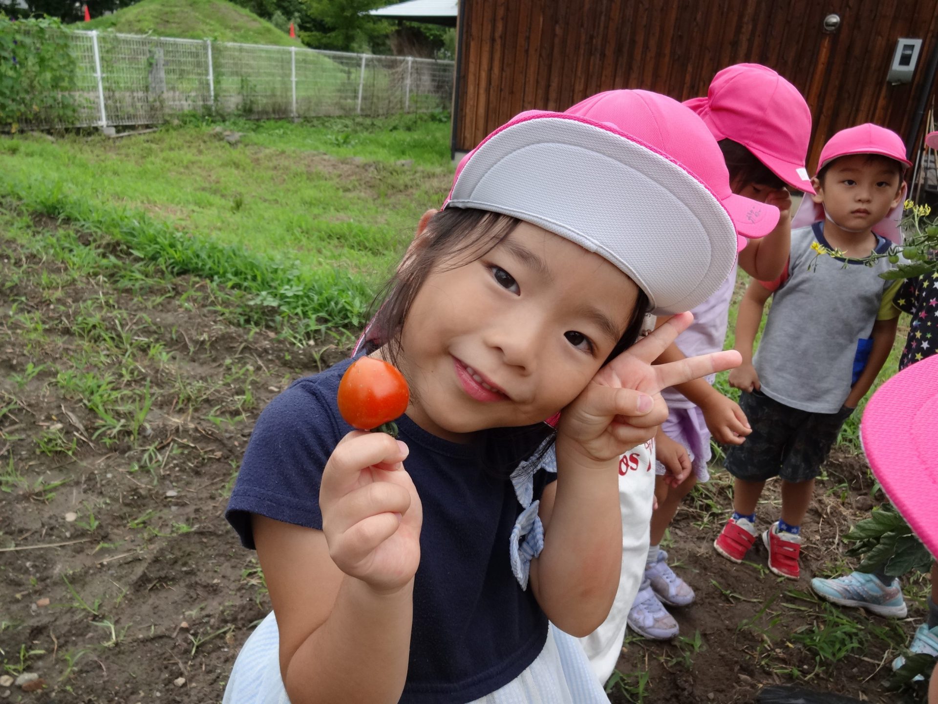年中の子どもたちの夏の日課は、畑で育てている野菜の収穫と水遊び、プール遊びです。