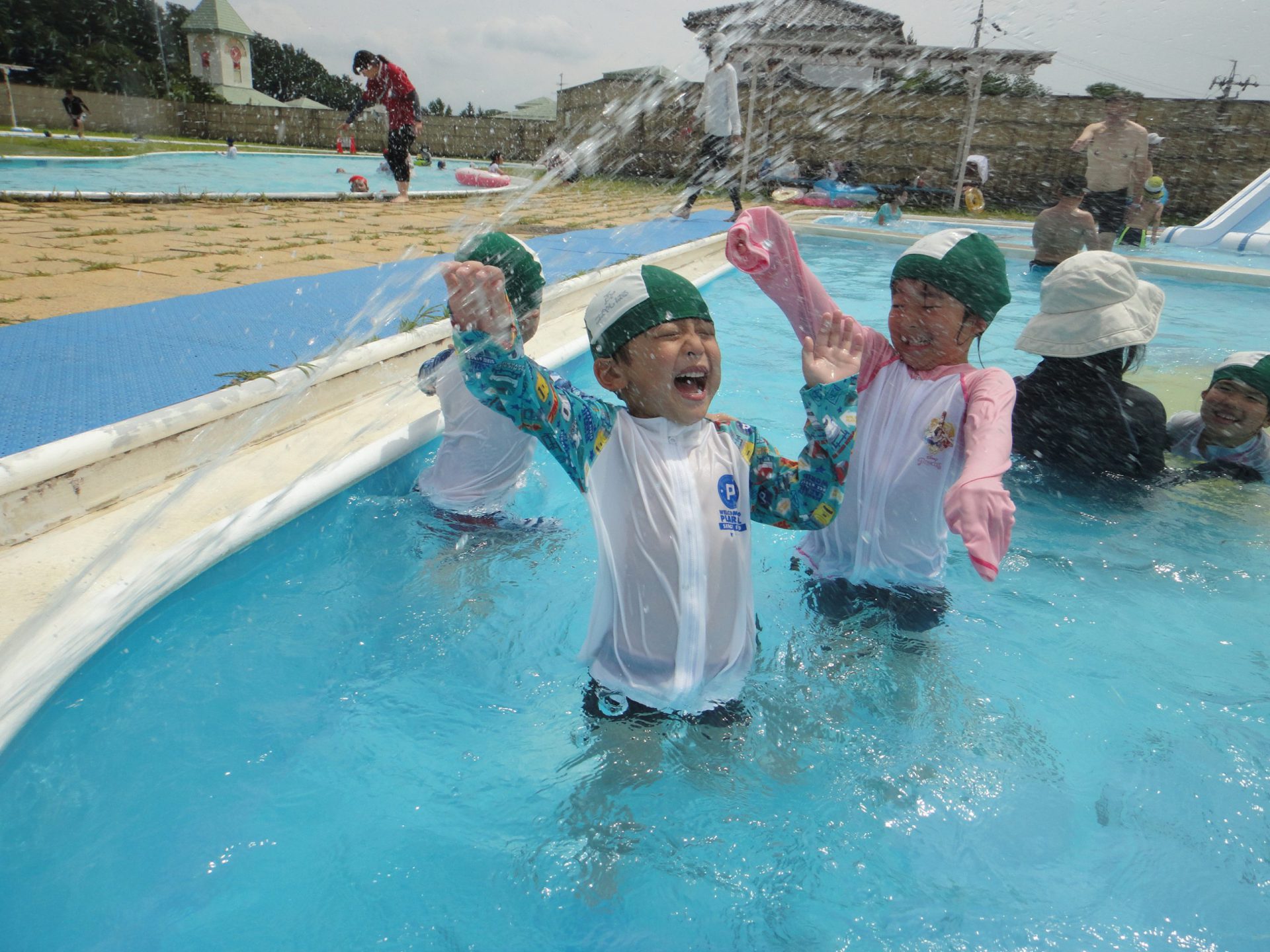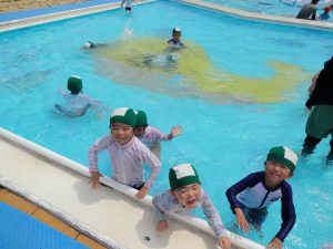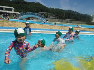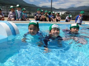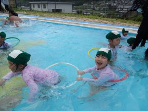 野菜収穫の後は、近くの村営プールへ出かけて遊びます。年中に上がると村営プールに入るようになるので、子どもたちはとてもうれしそう。みんなで水の中をグルグル回って流れるプールを作ったり、フープを使って遊びを楽しんだりして、水に慣れていきながら、水の心地よさを感じて遊んでいます。お友だちと一緒に遊ぶ姿もたくさん見られて、とても楽しそうです。