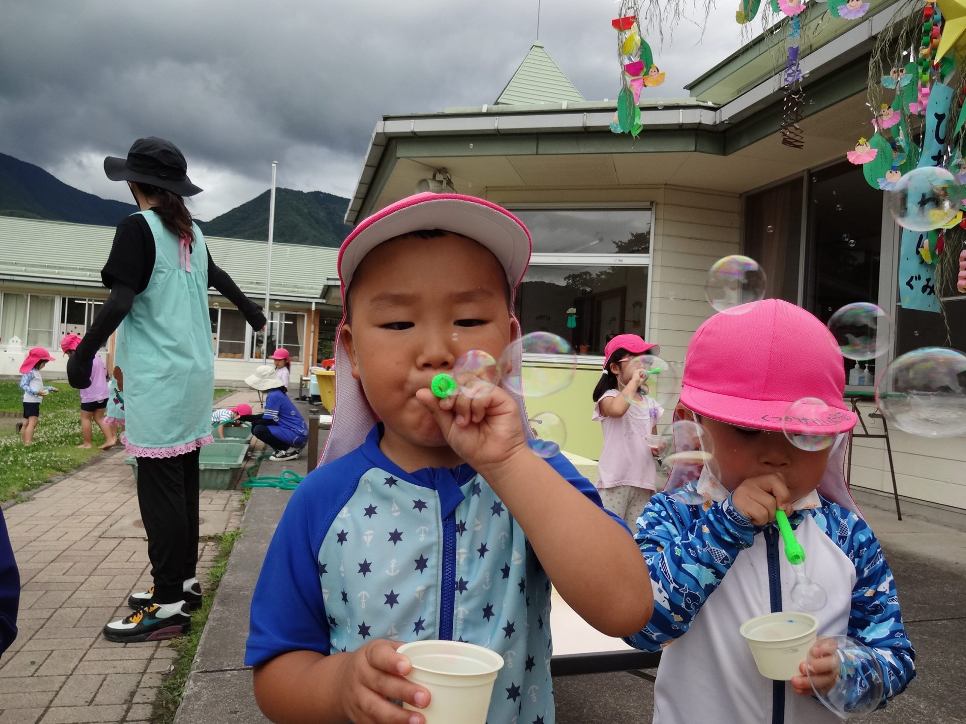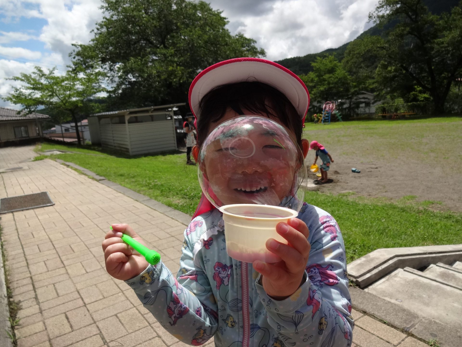 プールに入れない日には、園庭でどろんこ遊びやシャボン玉を楽しみました。