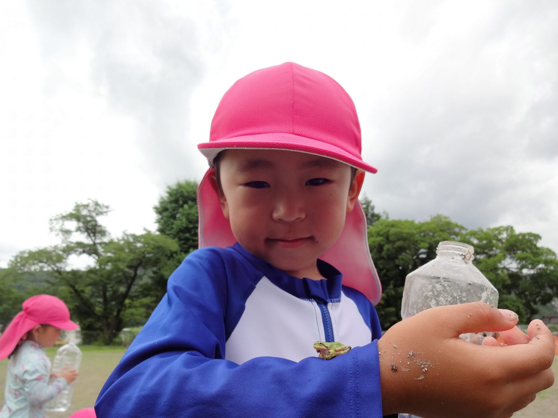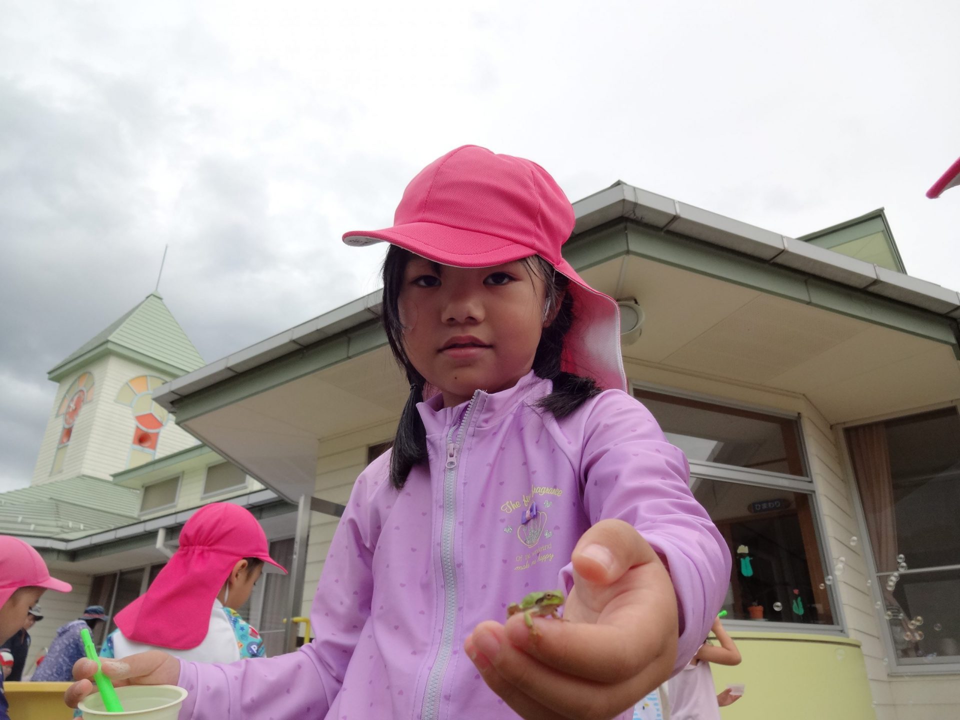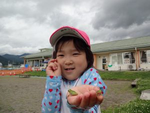 園庭で遊んでいるとカエルのお客さんが。「ほら!」と腕に乗せたりしてすっかりお友だち。中には、2匹3匹と手にしている子もいましたよ。