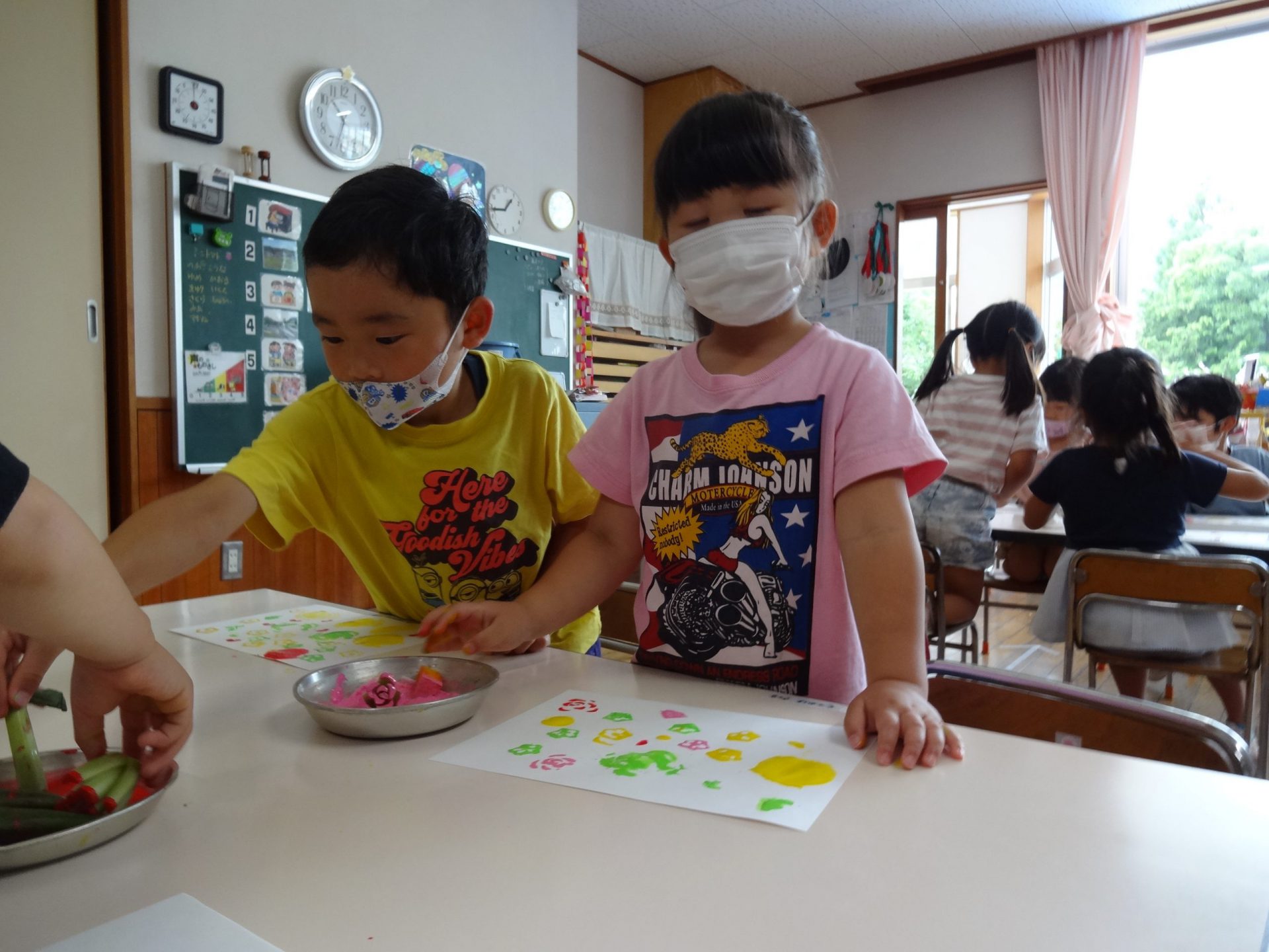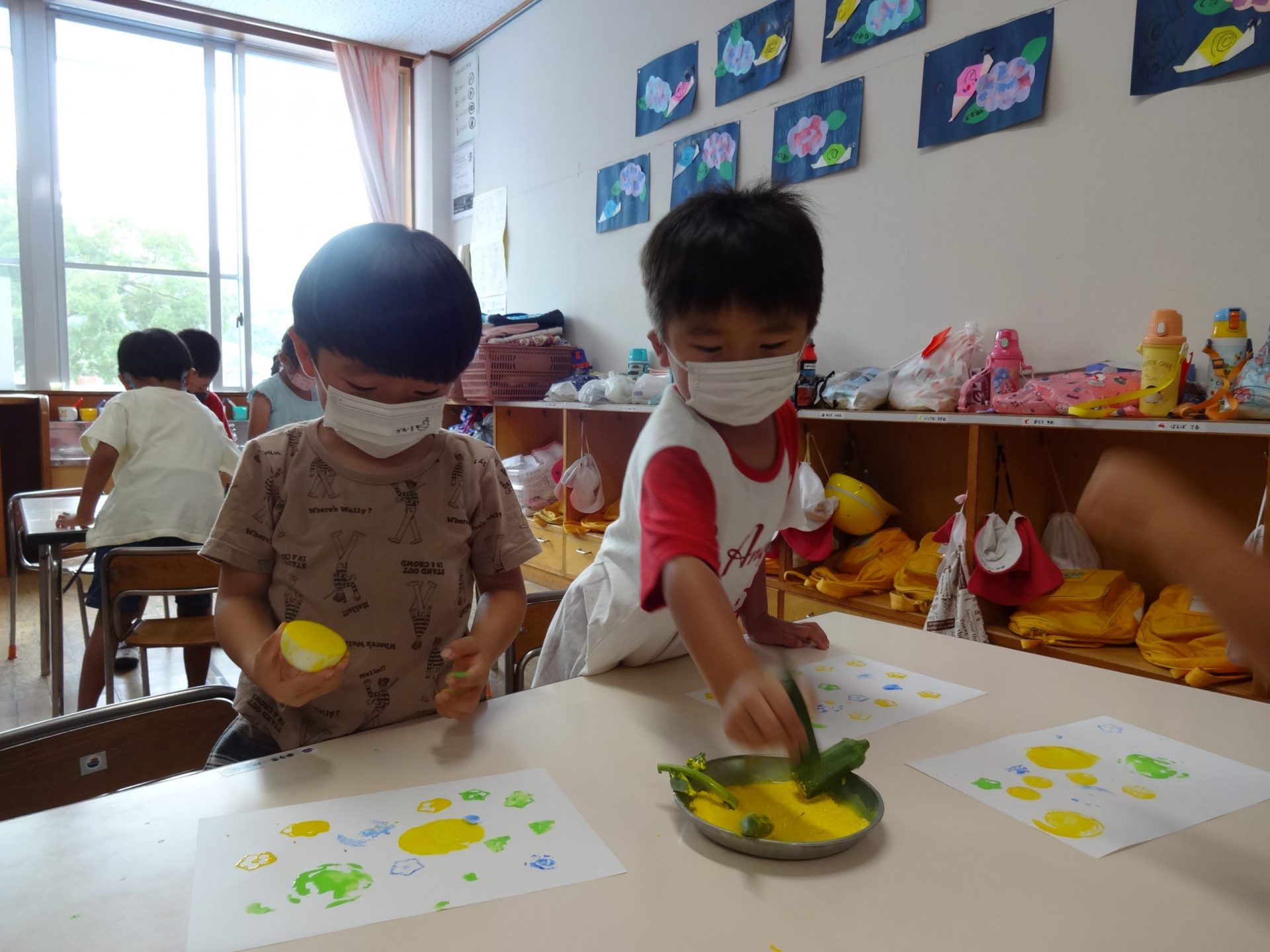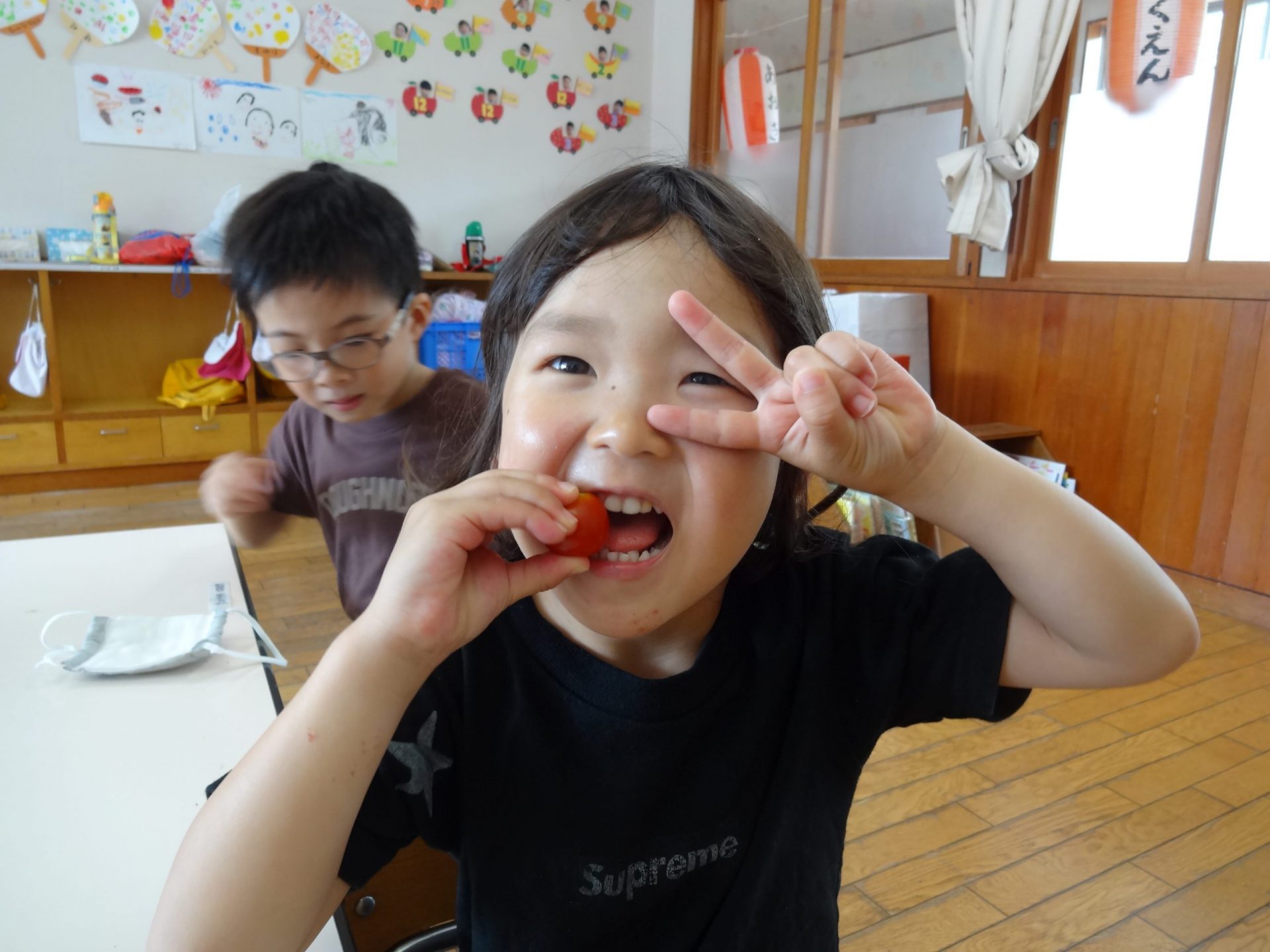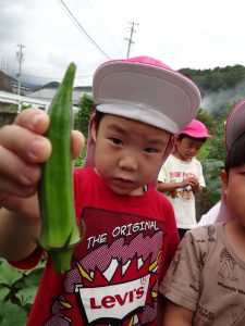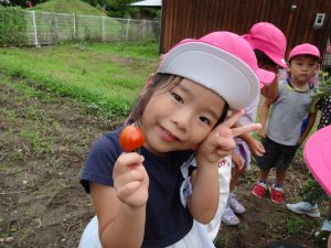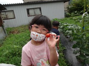 オクラや枝豆は給食の先生にお願いし調理して出してもらい、ミニトマトはお部屋で洗って早速パクリ。子どもたちはニコニコうれしそうに頬張っています。トマトが苦手な子どもたちもパクッと食べられるので、自分たちが育てて採ったものはやっぱり特別なんですね。