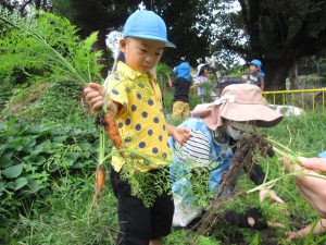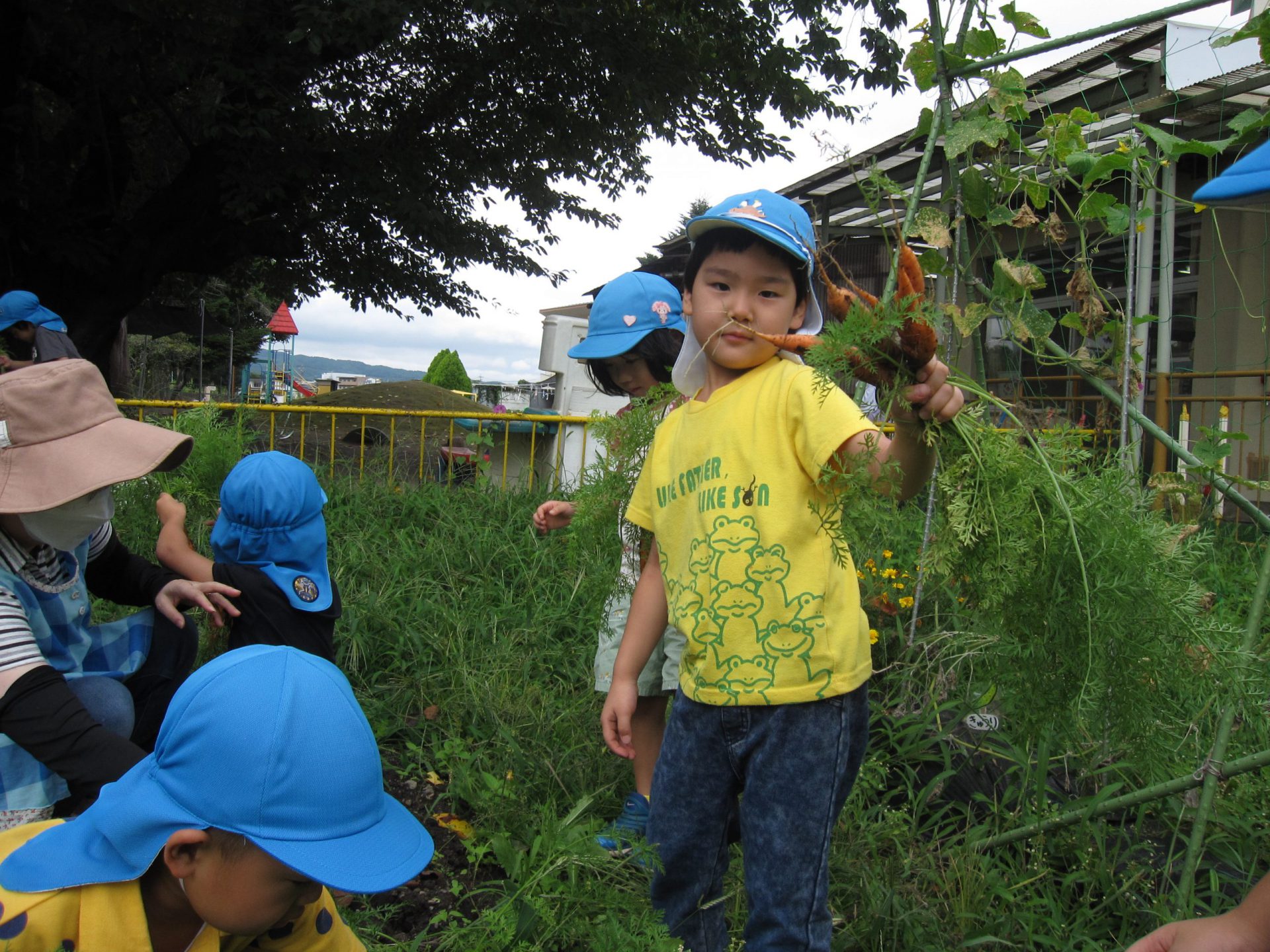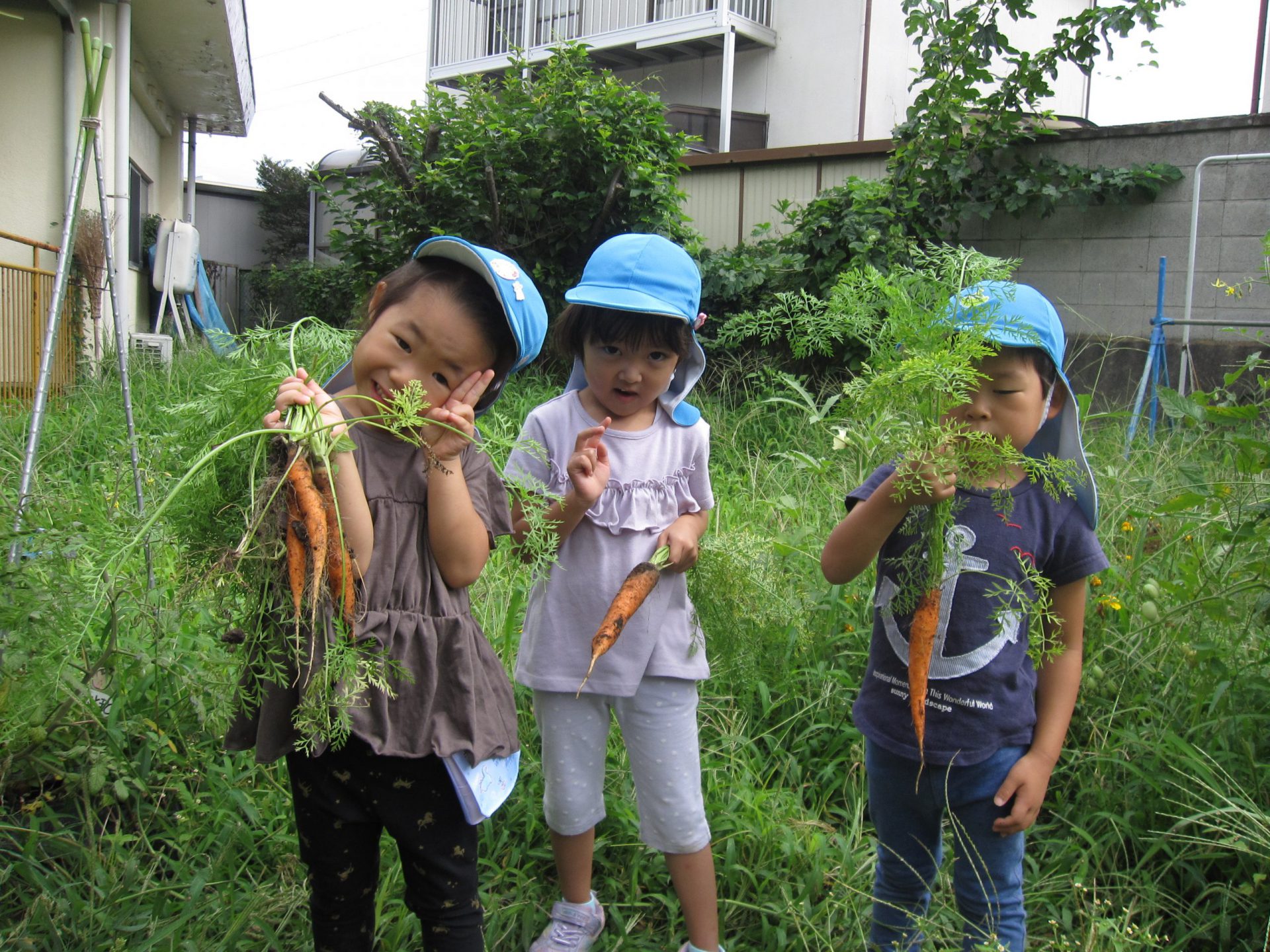 今夏は早くから暑い日々が続き、なかなか畑のお世話が継続してできませんでした。でも、子どもたちの気持ちは種まきした野菜たちに注がれていたんです。常に気にかける子たちがいました。そんな気持ちが通じたのか、今回の収穫につながりました。掘り出すたびに濃いオレンジ色の✨✨人参✨✨が出てきました。形は様々ですがどれもこれも、大事なりす組さんの人参たち。今日の給食の味はいうまでもありません。一連の体験ができるこの環境に感謝の一日でした。