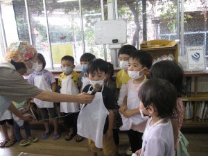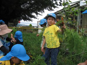 後日談「人参の葉にアゲハチョウは今回は来なかったですね・・・。少し期待していたのですがね」と担任。先生たちは、そこから広がる色々なな体験を期待しながら仕掛けているんです。そして、今日も何か考えてる向きが!何でしょうか?それは、後半の保育のお楽しみです。