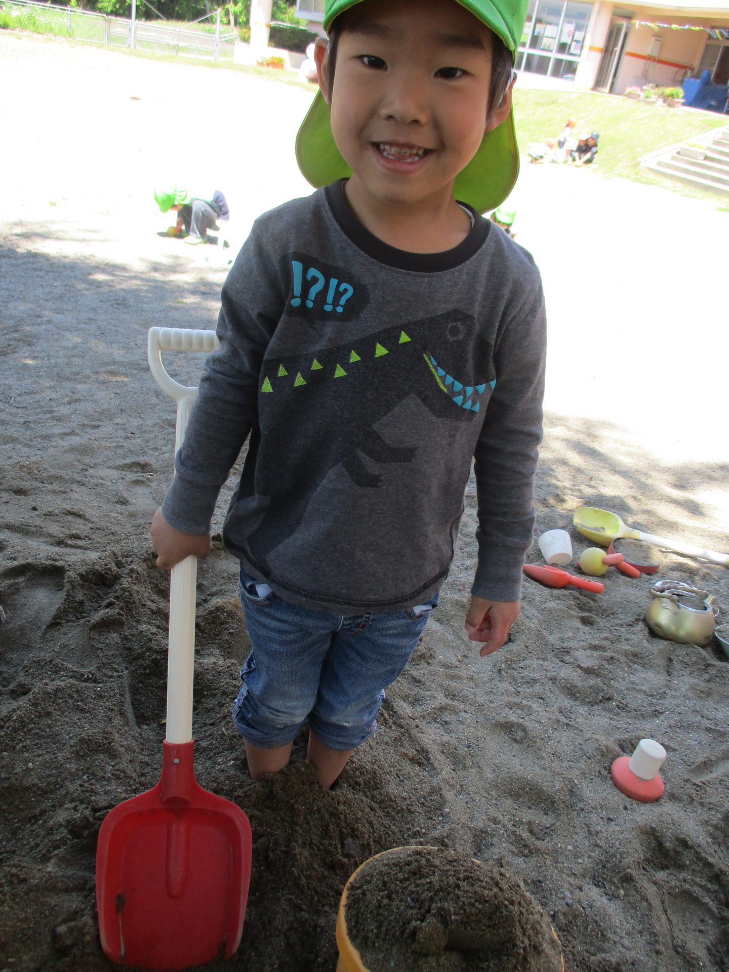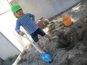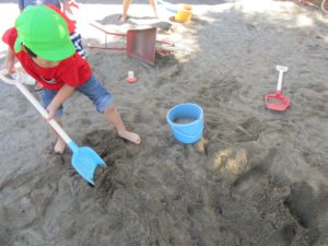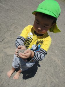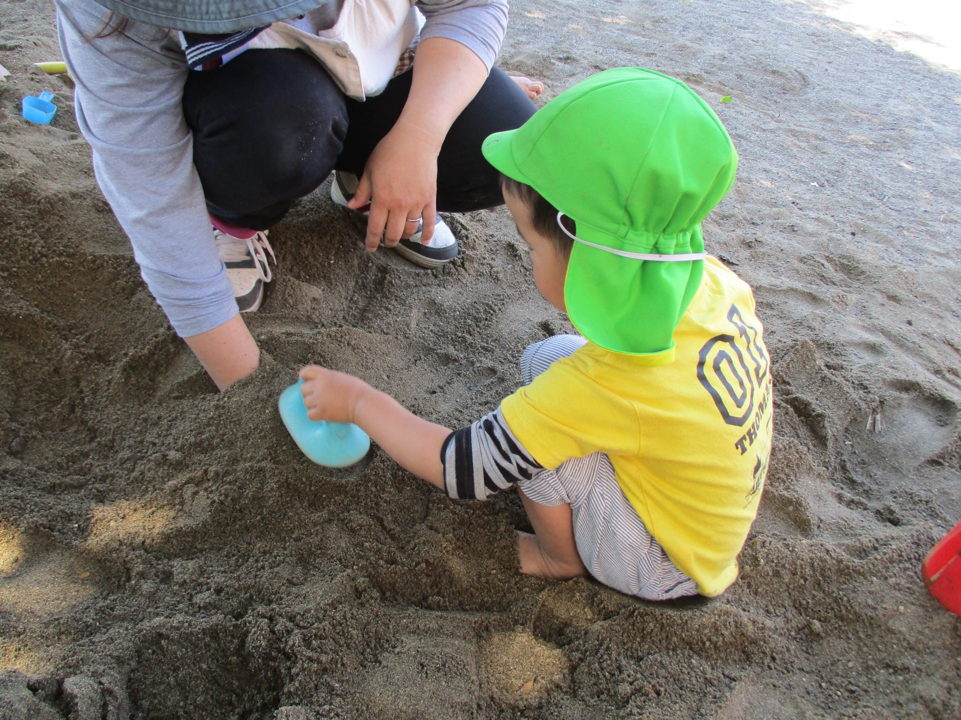 他にも、保育士の手を砂に埋め、出ないよう念入りに玩具で砂を押し固めたり。