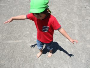 今日はこれから始まるどろんこ遊び・水遊びの前段階として、裸足で園庭へ。