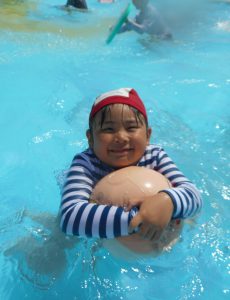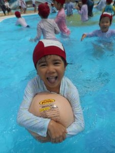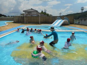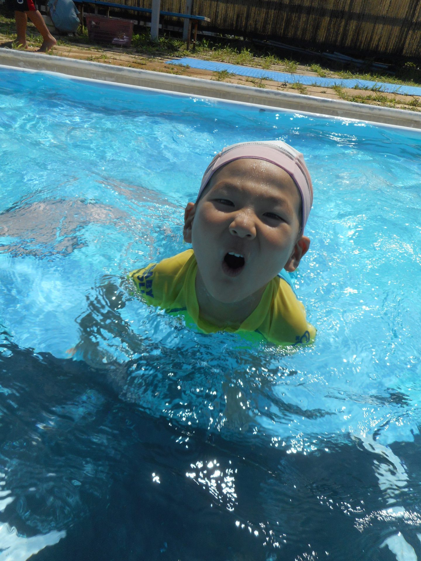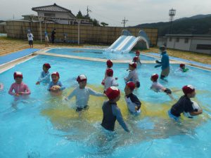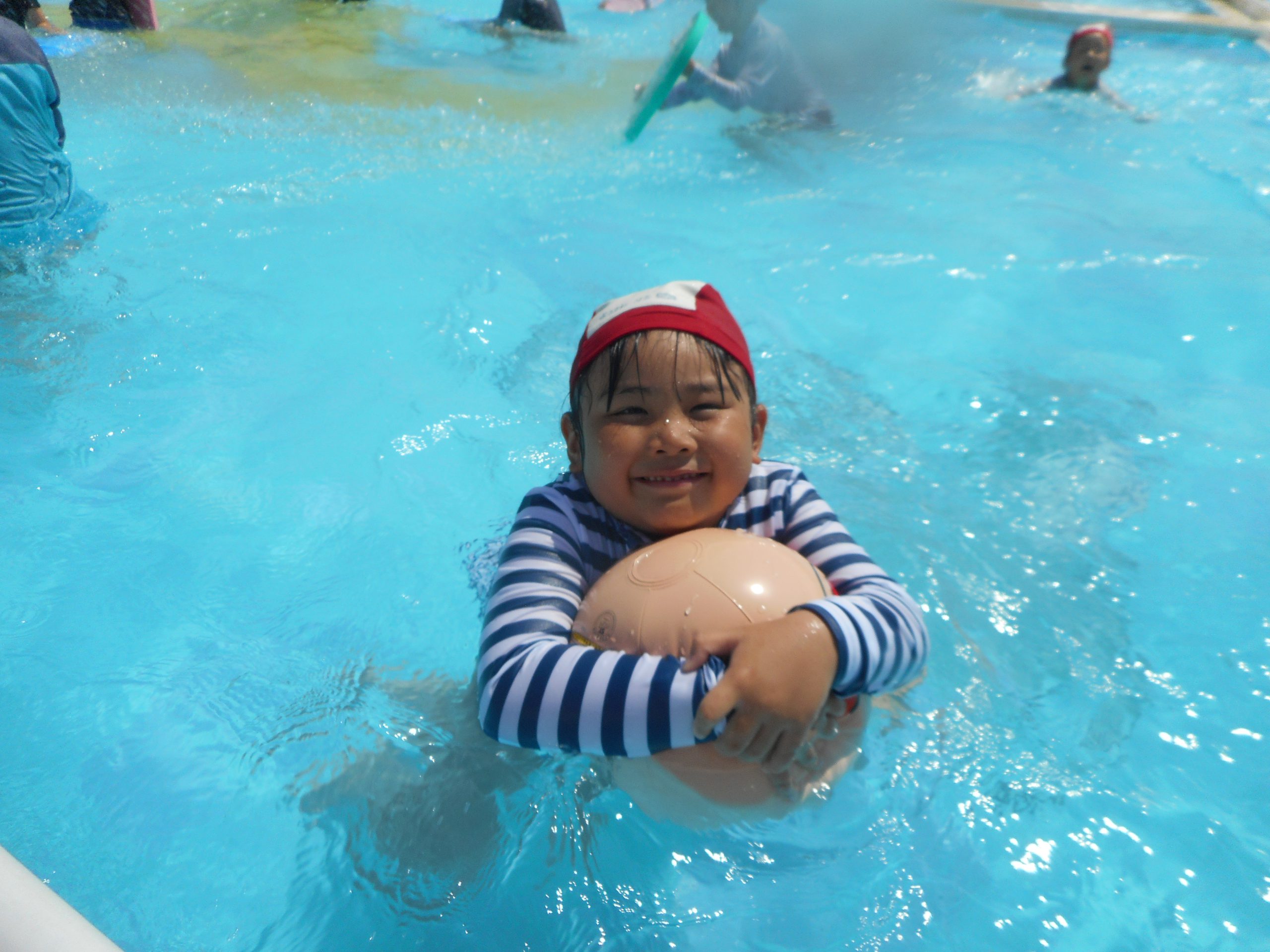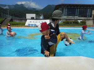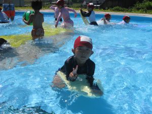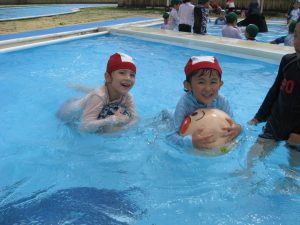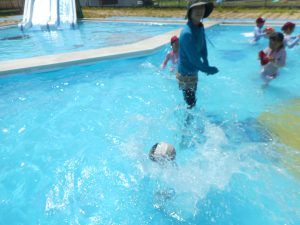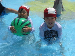 プールでは、じゃんけん列車、宝探しゲームや、プールの中で回って回ってみんなの足の力で流れるプールも作りました!