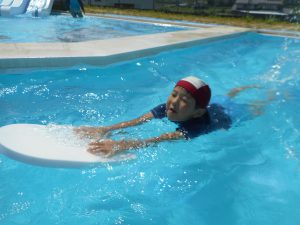 6月後半、いよいよプールが始まりました。年中、年長の大きい組は、村のプールへ通います。