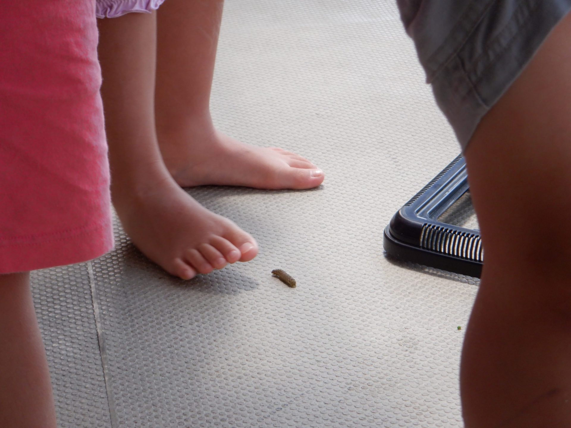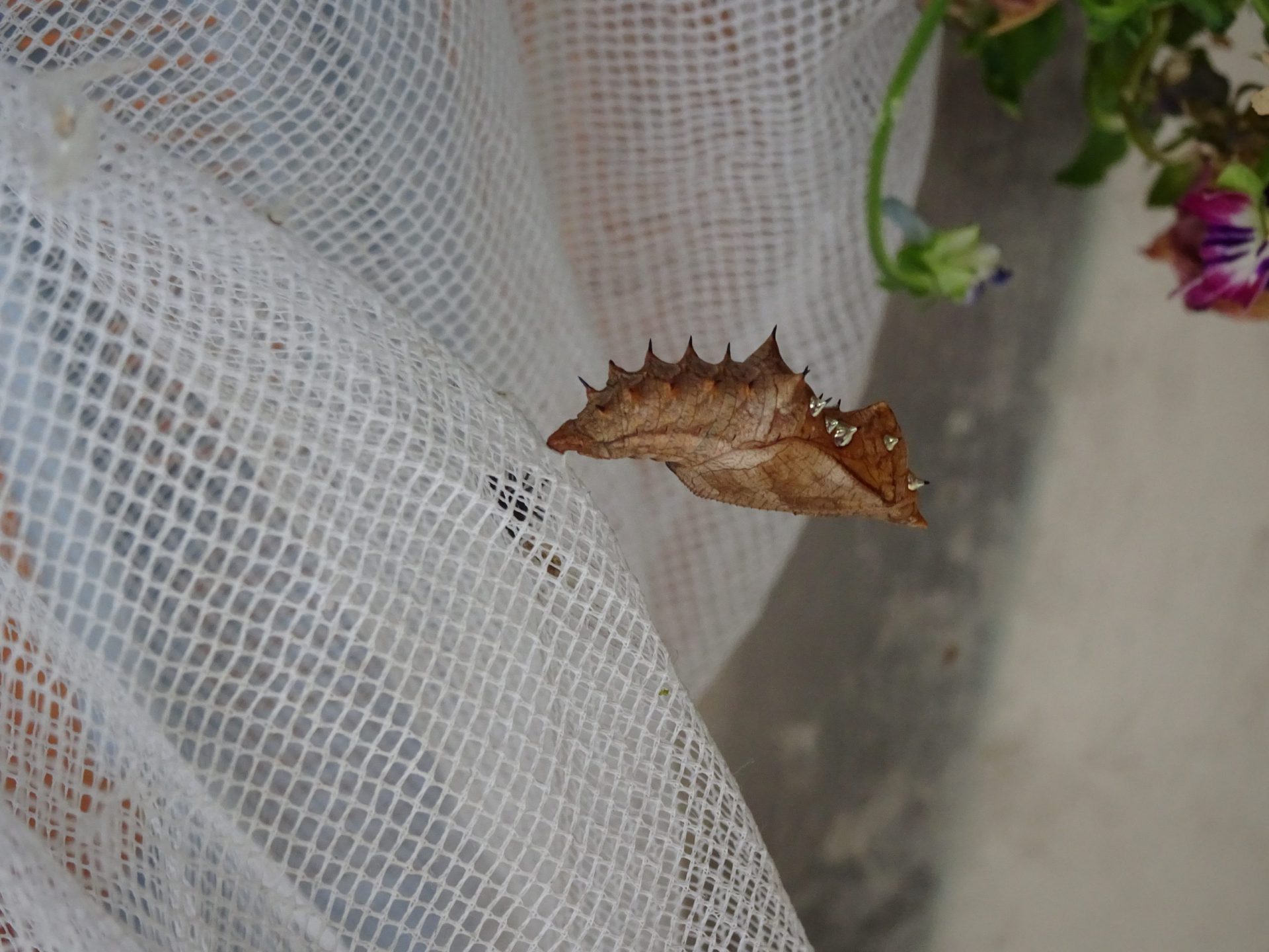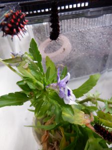 ツマグロヒョウモンの幼虫をテラスに這わせて観察中。