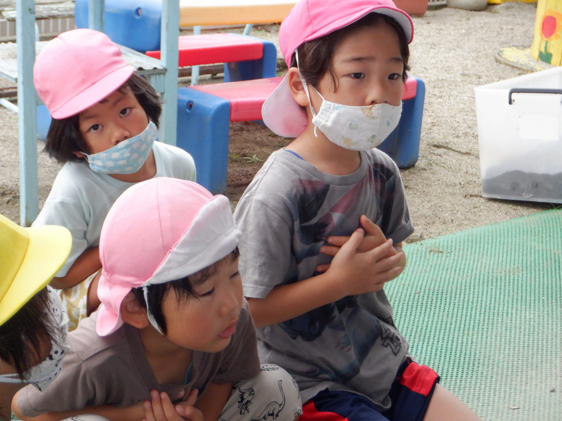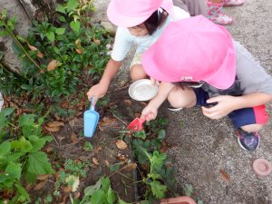 みんなでお墓を作り「天国へ行ってね」「また保育園に来てね」と手を合わせました。