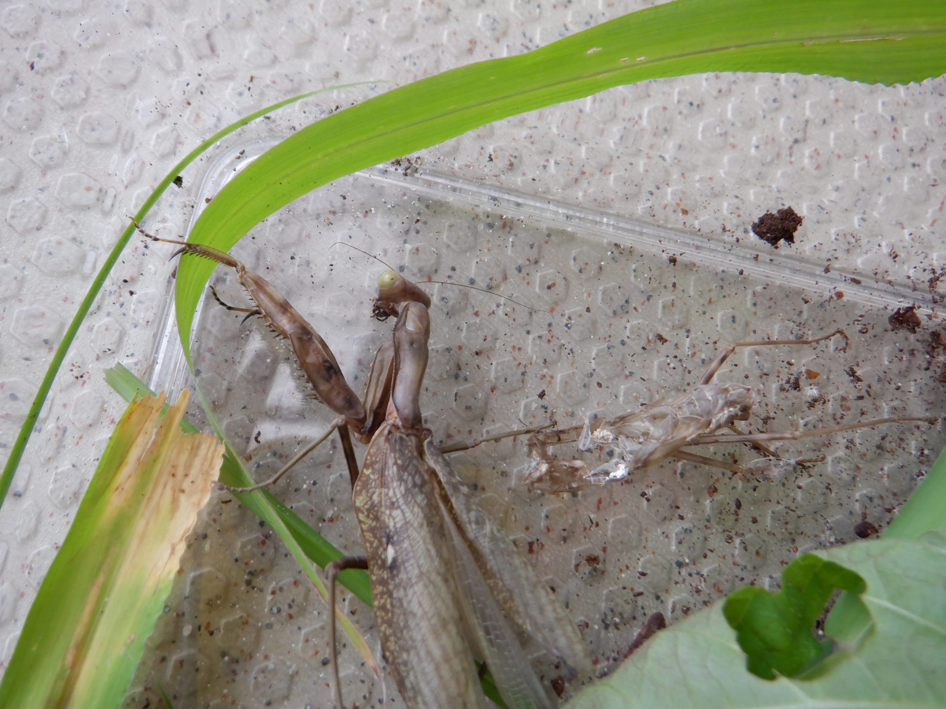 「なんかあるよ?」「死んだカマキリ?」と覗いてみるとかまきりが脱皮していました