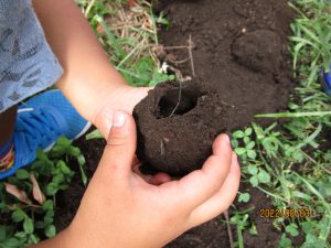 丸く固まった土の塊に、中からは抜け殻のようなものが出てきました。