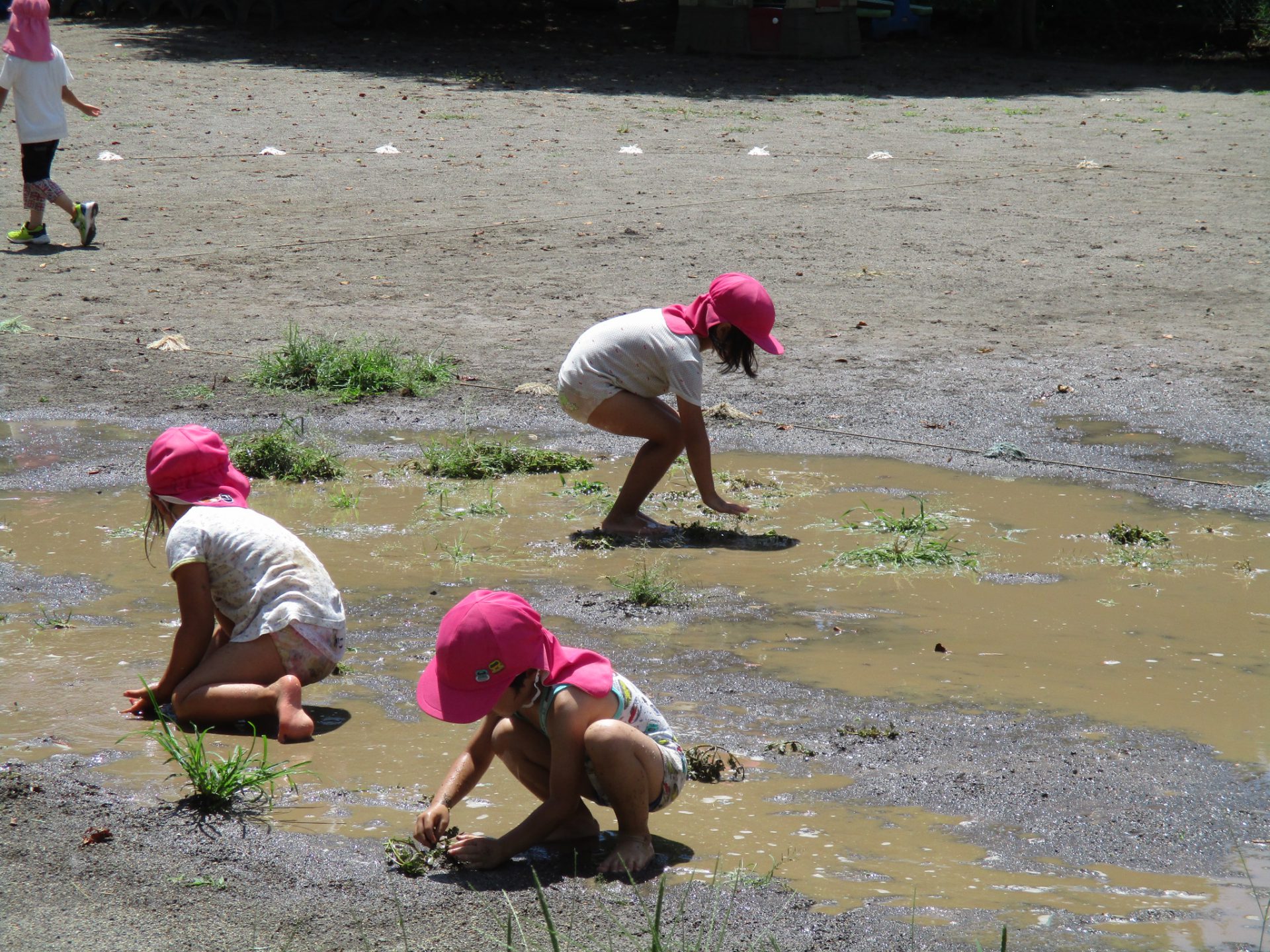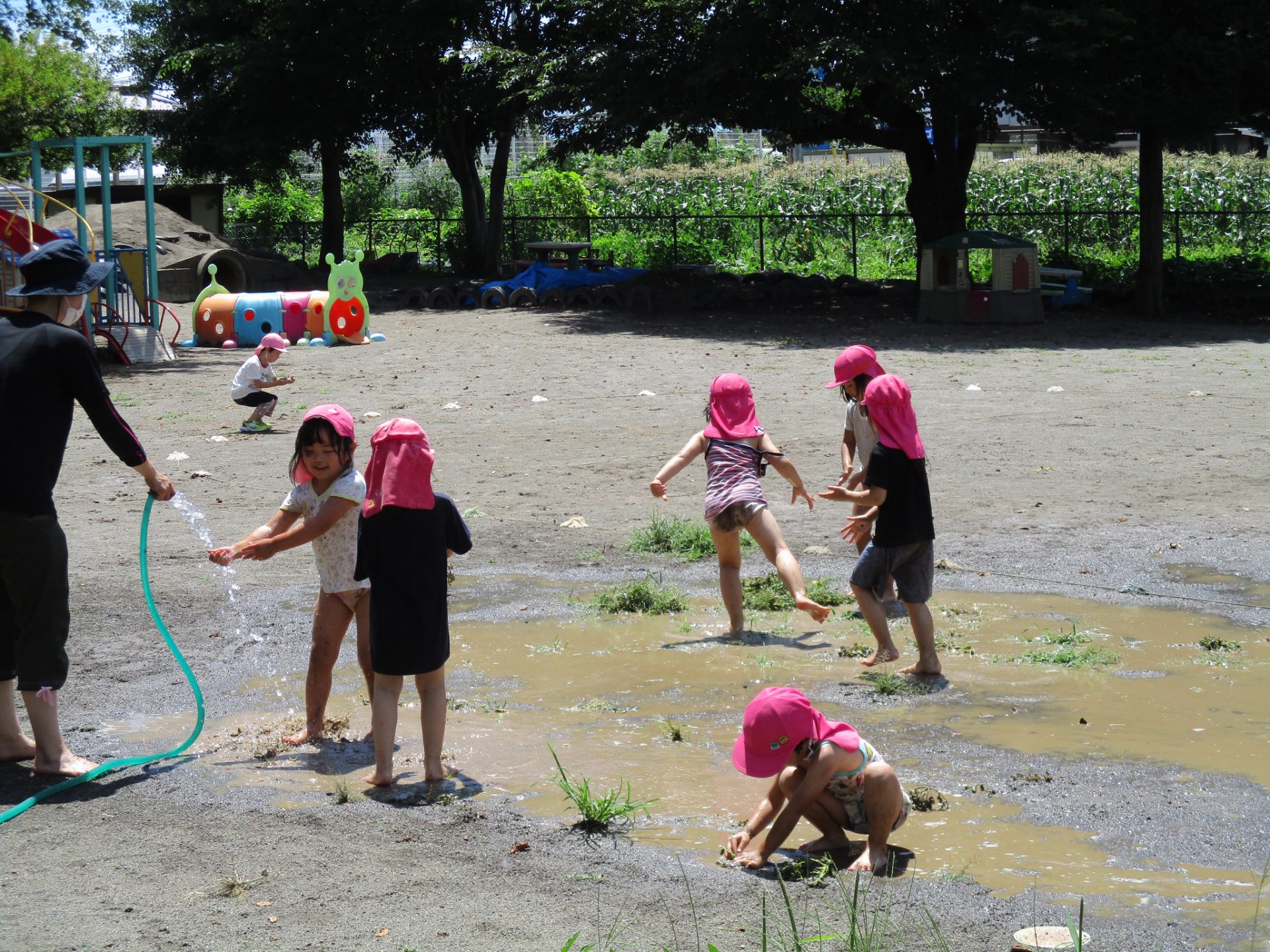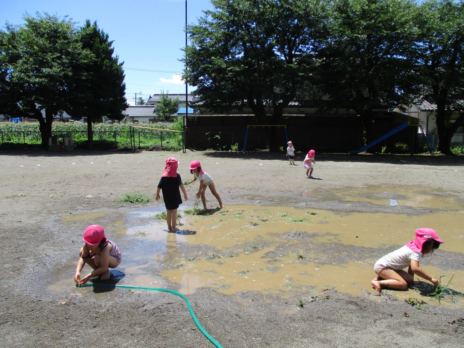 高瀬保育園では、毎日、プールチームと泥んこ遊びチームに分かれて遊びを楽しみました