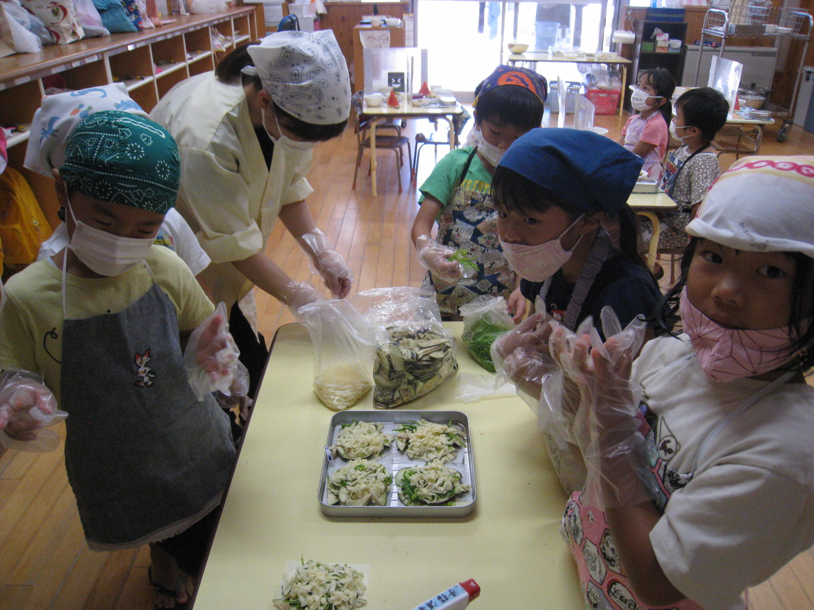 チーズトーストクッキングの前にナスの浅漬け作りをしたが、ナスは独特の味がし、「大人の味…」といい、苦手な子が多かったため、給食調理員と子どもたちがおいしく食べられるナスのクッキングはないか話し合い今回のクッキングが決まった。