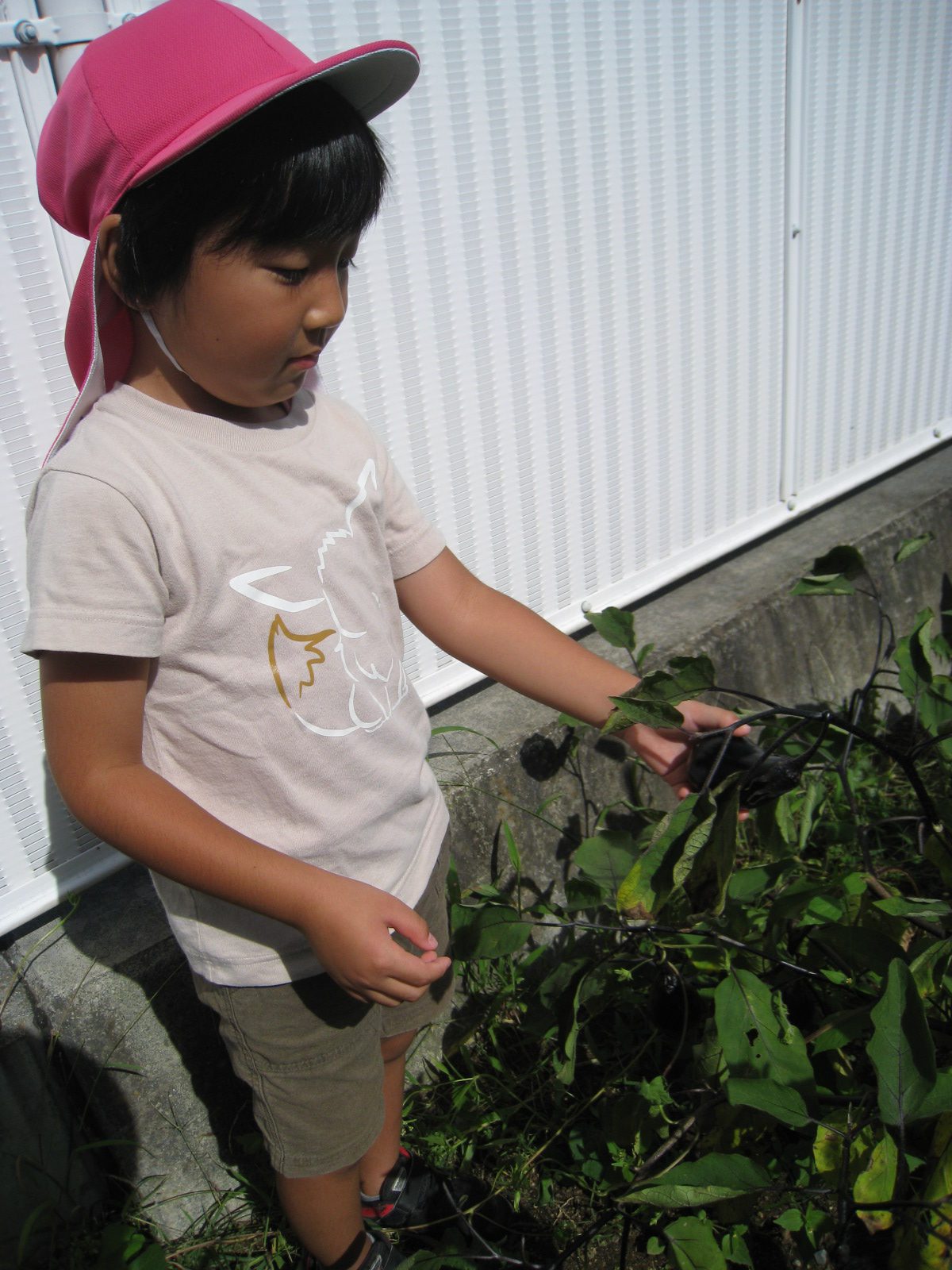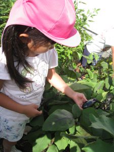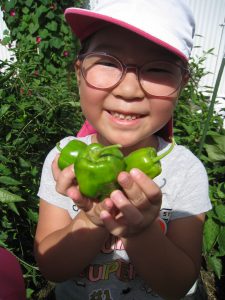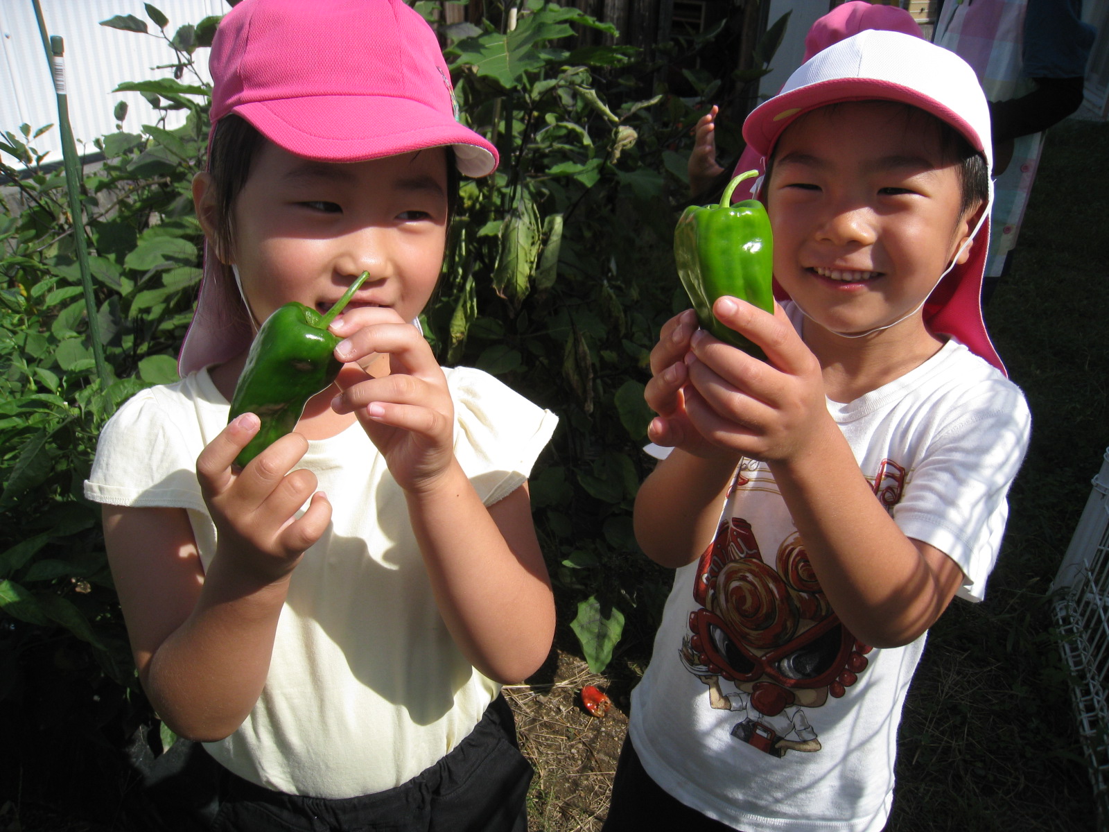 春に自分たちで苗を買い、植えたナスとピーマンが生長し、たくさん収穫できるようになった。