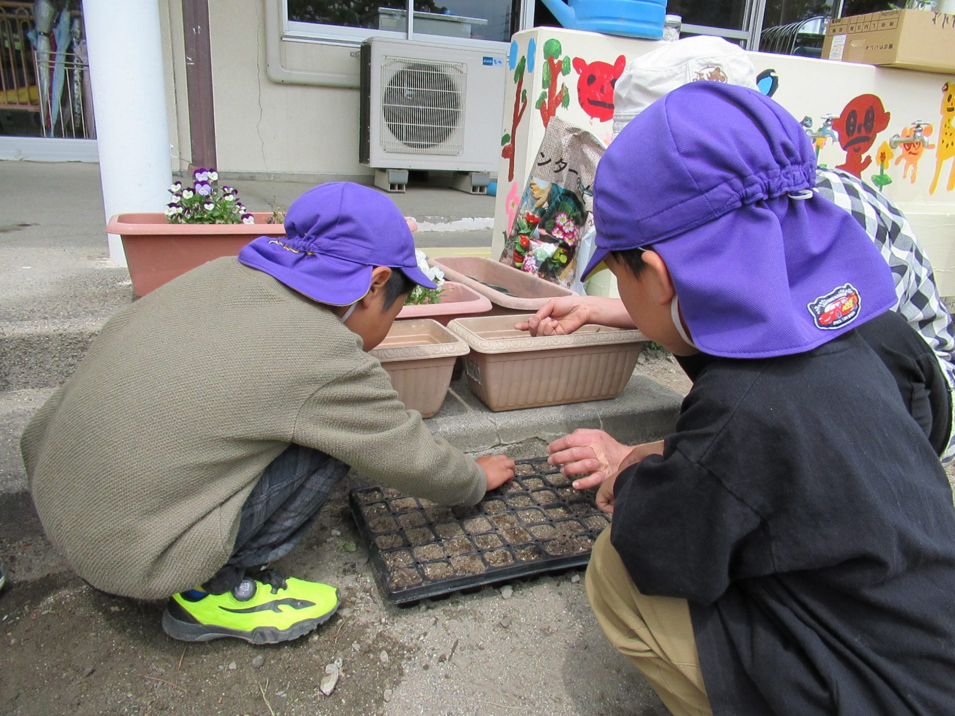 「種ってちいさいんだね」「野菜のもとを落とさないようにしよう」「これじゃがいもじゃん」などと興味を持ったり疑問に思ったりしながら取り組んでいました。
