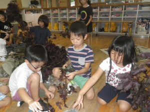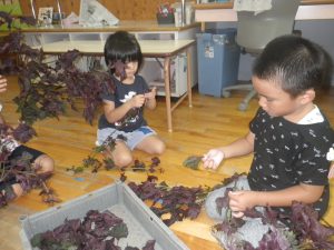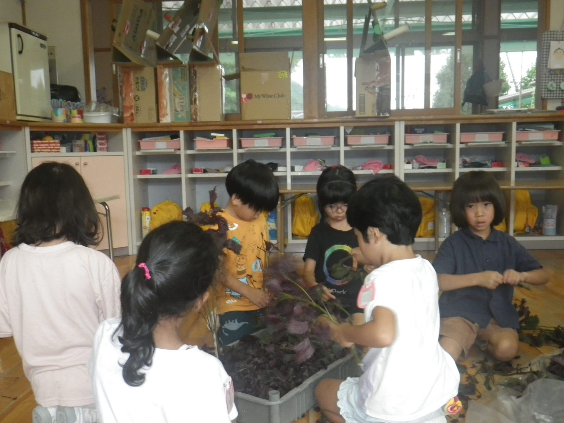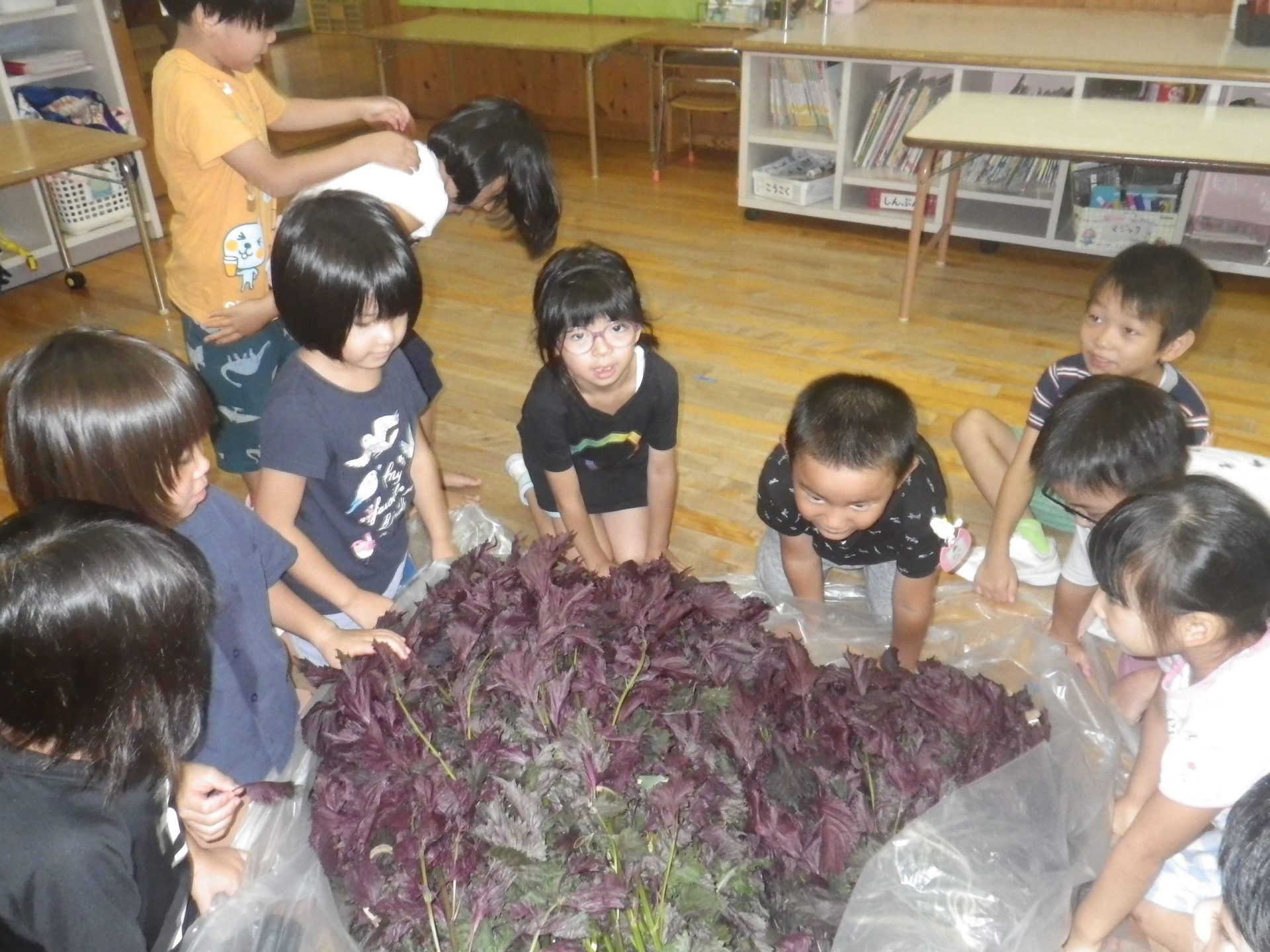 そんな年長さんに畑でたくさん穫れたから、と大量の赤紫蘇をいただきました。