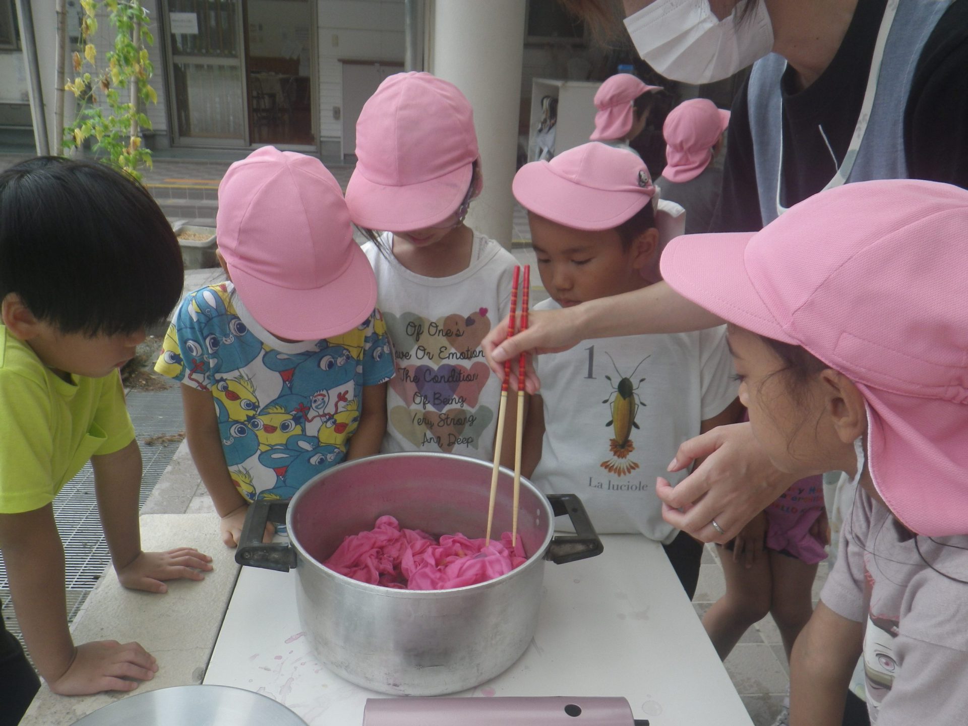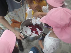 今回、ご厚意でたくさんの赤紫蘇をいただき染め物体験できたことは、子ども達にとってとても貴重な経験となりました。