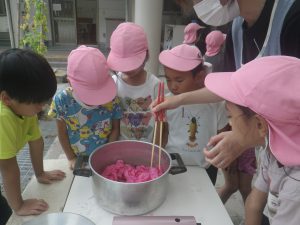 集める花の種類や袋に入れて揉む、棒でたたいてつぶすなど色の出し方も子どもたちが何度も試して、工夫して、友だちと一緒に習得してきました。