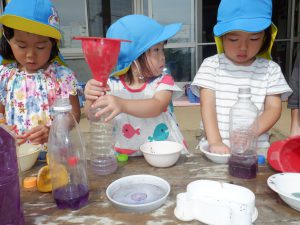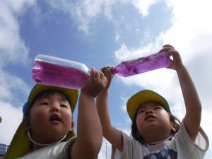 友達の見様見真似でじょうごを使って色水を溜め、出来上がった1本のペットボトル、嬉しかったことでしょう。それを持って空を見上げたら、キラキラ光っていることに気づいた子ども達。さらに友達を一緒に楽しめて大満足です。気づいたことを保育士にも見せようと、声をかけて見せてくれたことが嬉しく思いました。