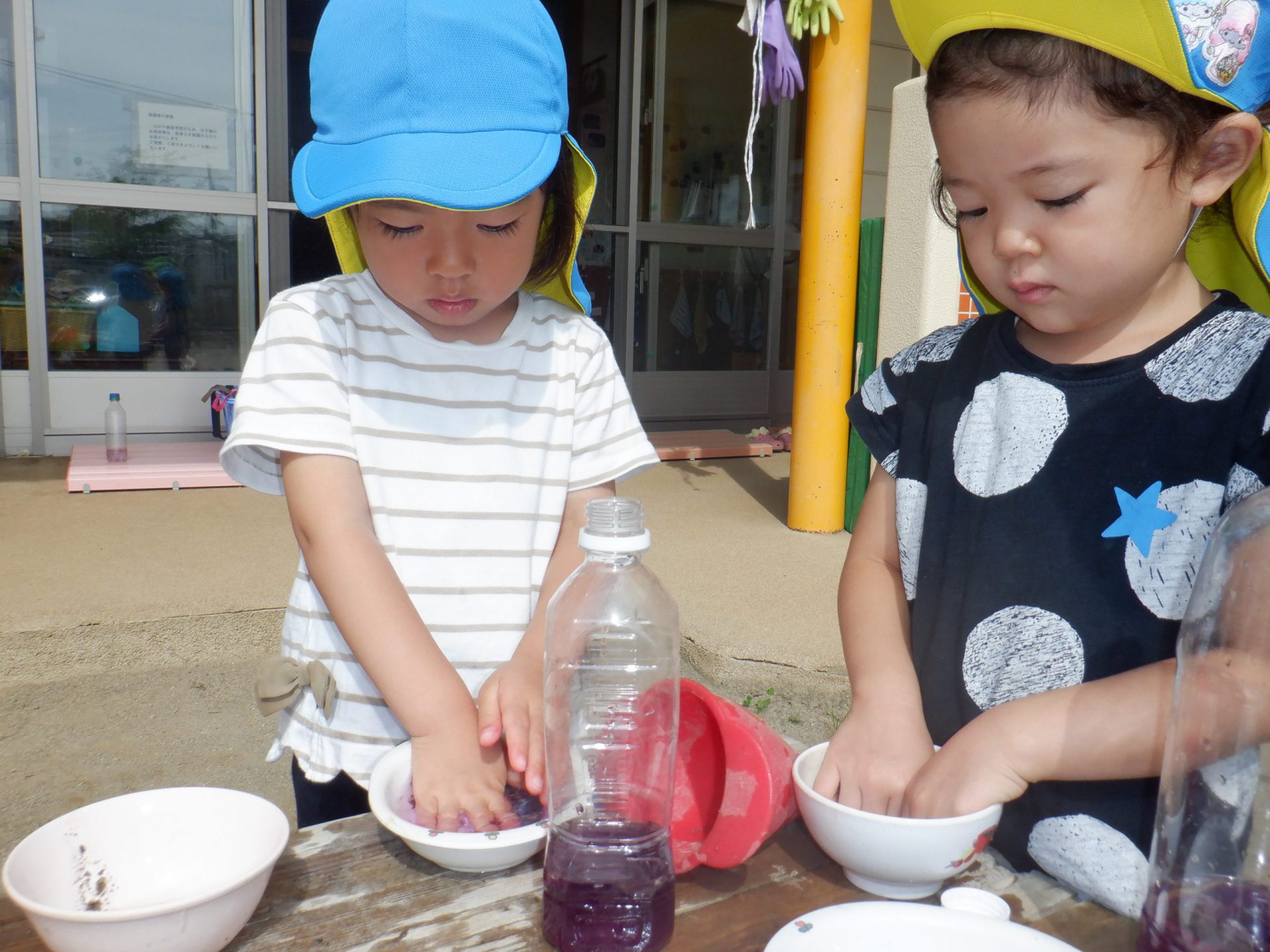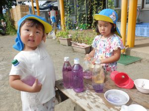 「せんせー!みて!みて!」と、保育士をしゃがませ、「上を向いて」と言います。お日様の光で、ペットボトルの色水がキラキラしていました。