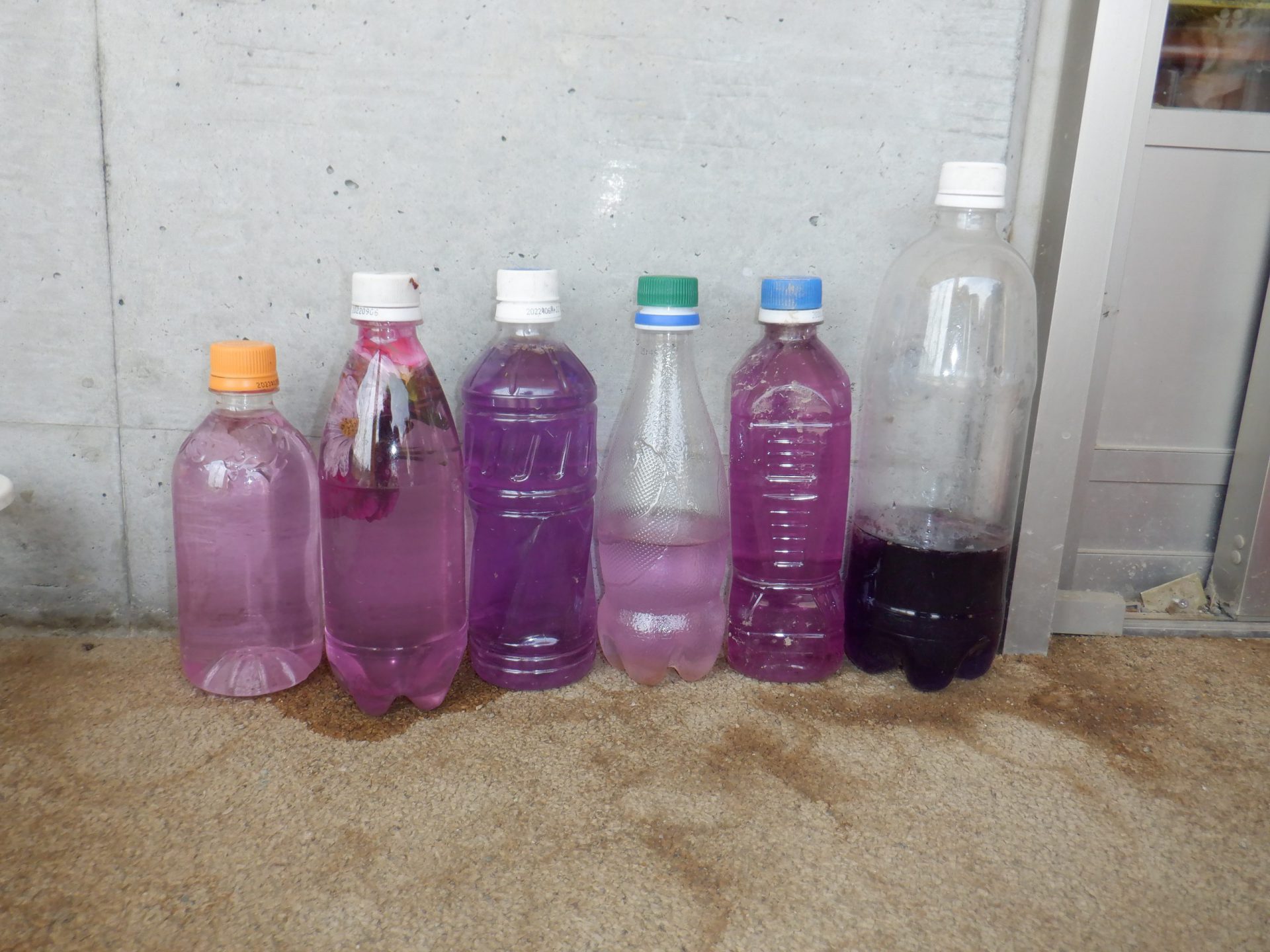 友達の様子を見ながらペットボトルに色水を溜めていきます。