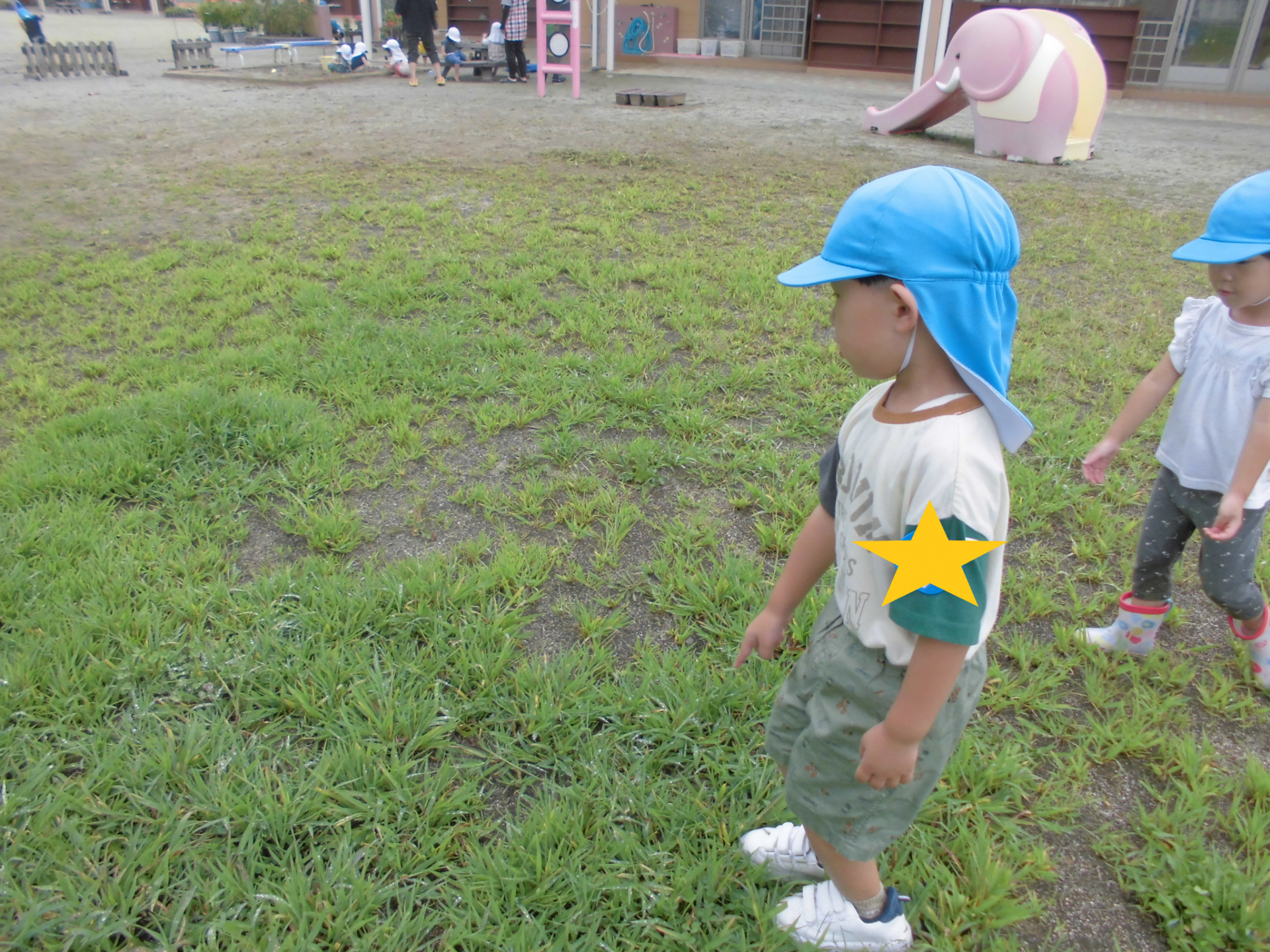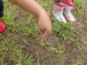 ・雨上がりの戸外遊びでいつもとは違う自然を発見し、驚き、友達にも知らせようとすることで、不思議さを共有したり、また、友達も興味を広げて新しい発見へつながったりして、自分で実際に触れてみるという貴重な体験を一緒に喜び合うことができました。これからも季節や天気を身近に感じていけるように戸外で自然に触れ、遊びを思いきり楽しんでいって欲しいと思います。