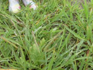 雨上がりの後、戸外に出て遊んでいると、草の上にあるキラキラ(しずく)に気が付いた子どもたち。