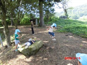 遊び慣れた場所で四季折々の風景や草花、昆虫などに触れ大自然を満喫している子どもたち。広々とした神社の中で心も体も開放してのびのびと思いきり体を動かし、楽しんでほしいです。