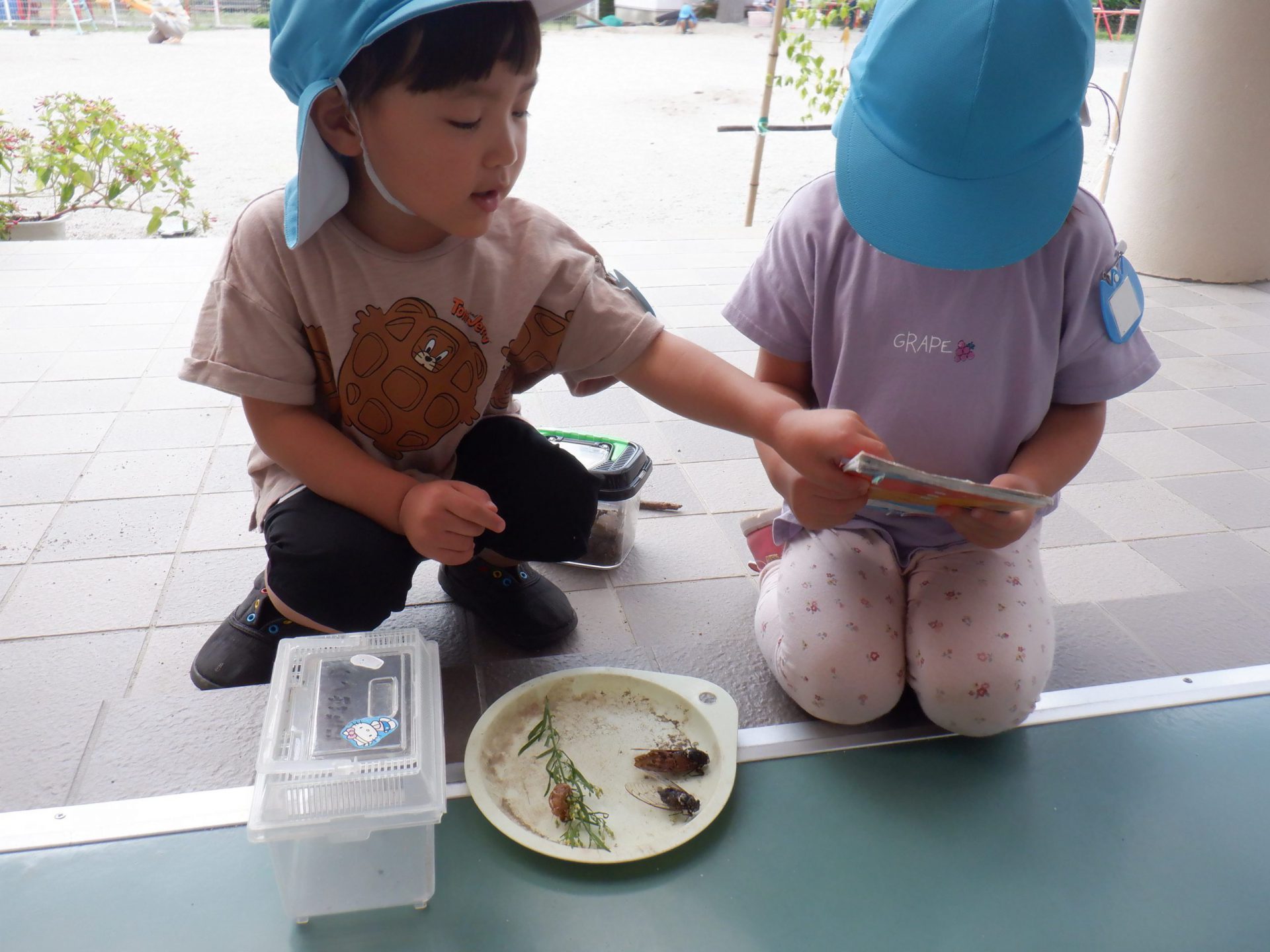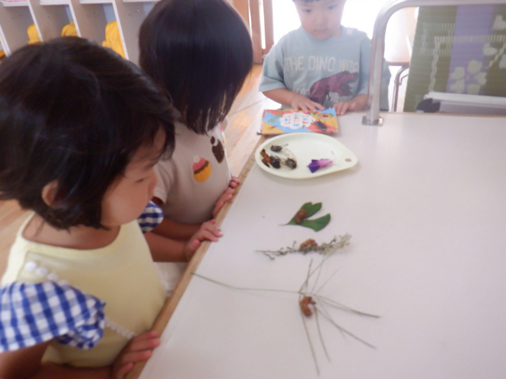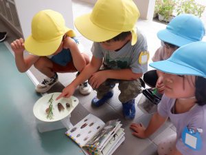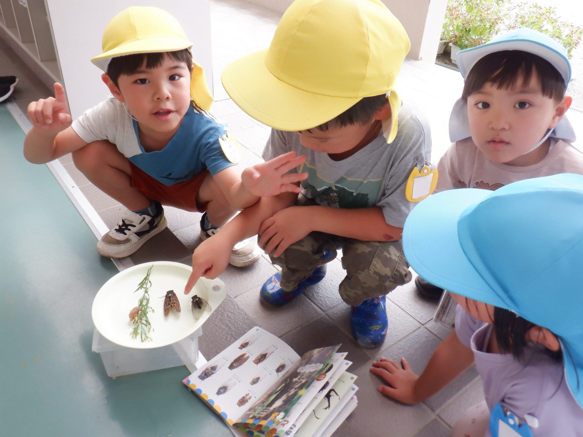 部屋の自然物コーナーがいつのまにかセミやカブトムシ、オニヤンマなどのたくさんの虫が集まり、虫博物館になりました。見つけた虫をいつも皆で共有すること、図鑑で調べてよりその虫を知ること、図鑑で調べてより観察しやすく虫とはじめて触れ合う子ども達にはちょうど良い場になりました。