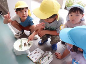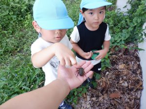 子ども達の身近にはいつも様々な虫がいます。はじめに触れ合ってきた、だんごむしから子ども達は虫探しが大好きになり今日も「虫探ししたい!」と張り切っています。