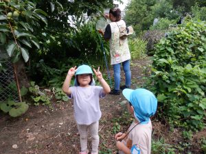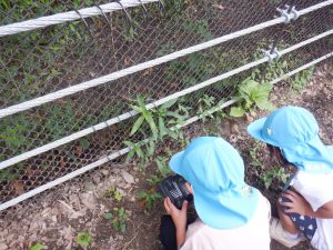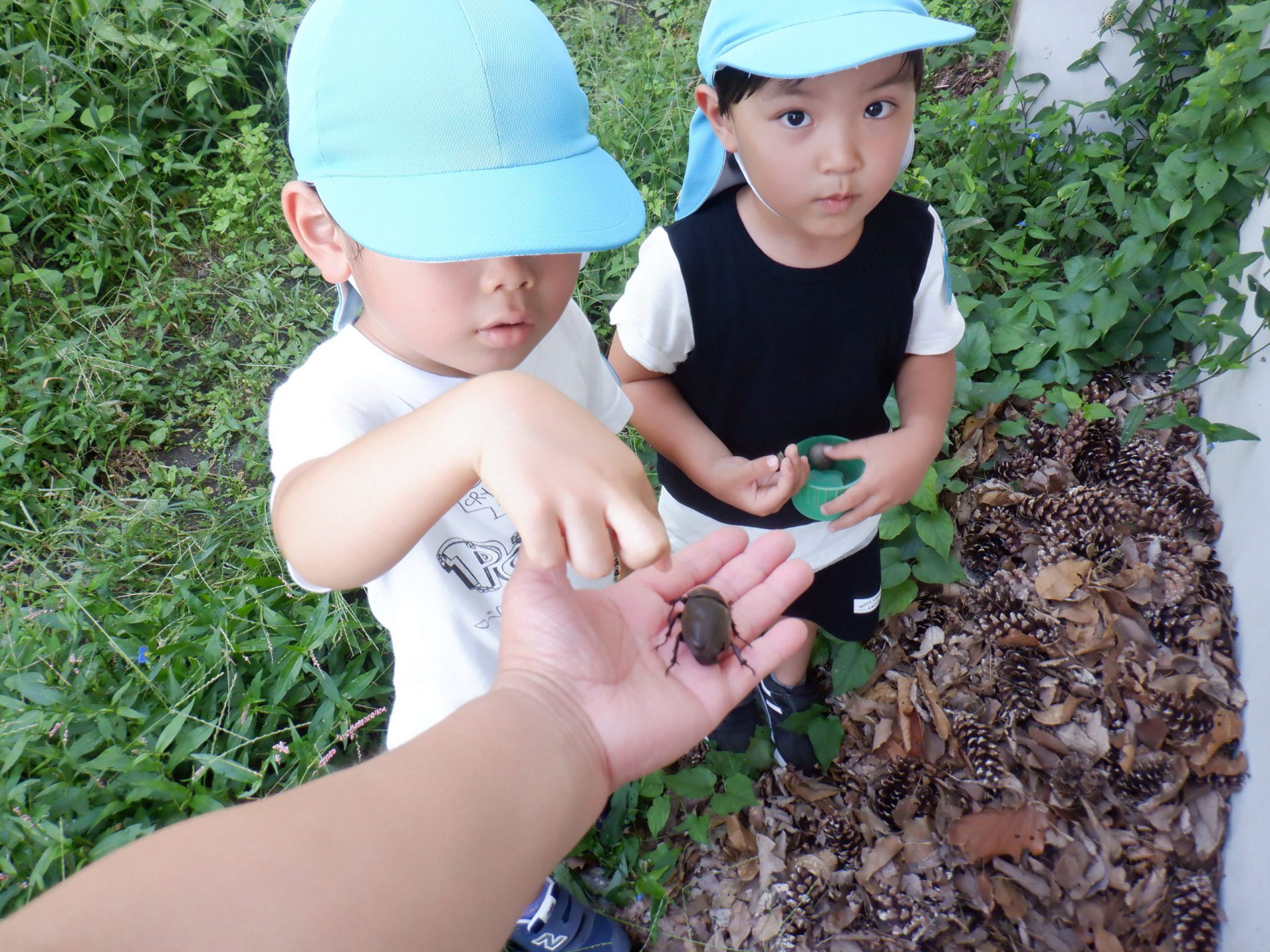 虫がとても身近な環境の中、はじめは苦手だった子も今では自分から虫探しを楽しみ興味津々です。