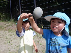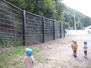 今は、裏山からセミの鳴き声がよく聞こえ園庭にも飛んできます。