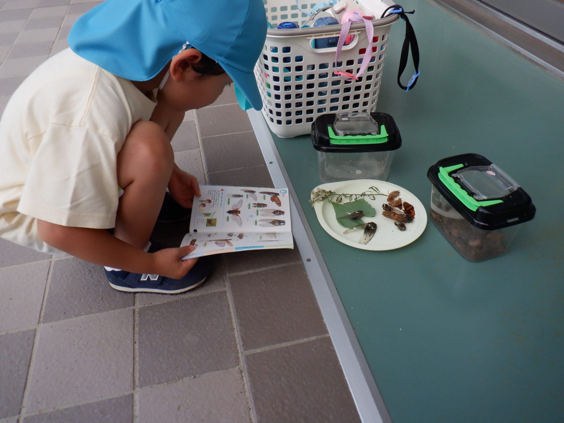 セミの名前を知りたくて、さっそく年上児に教えてもらった図鑑を見て見比べてみます。