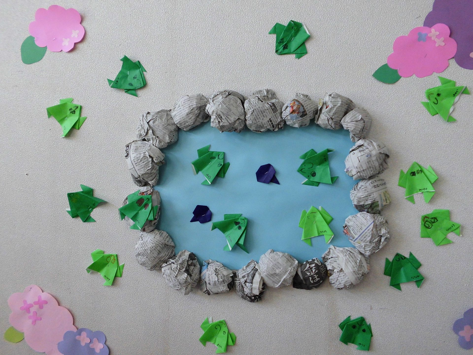 年長さんは”カエル”を、折り紙で作りました。おたまじゃくしが元気に育ってカエルになるのが楽しみです。