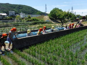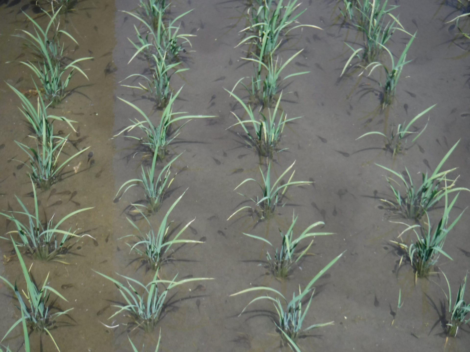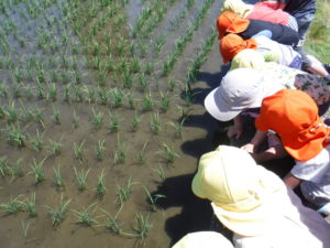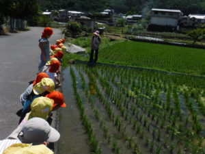 歩いていると、田んぼで何かを発見!!みんなで田んぼを眺めます。
