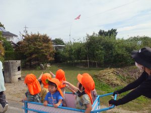 稲が刈り取られてなくなっていることに気付いた様子です。