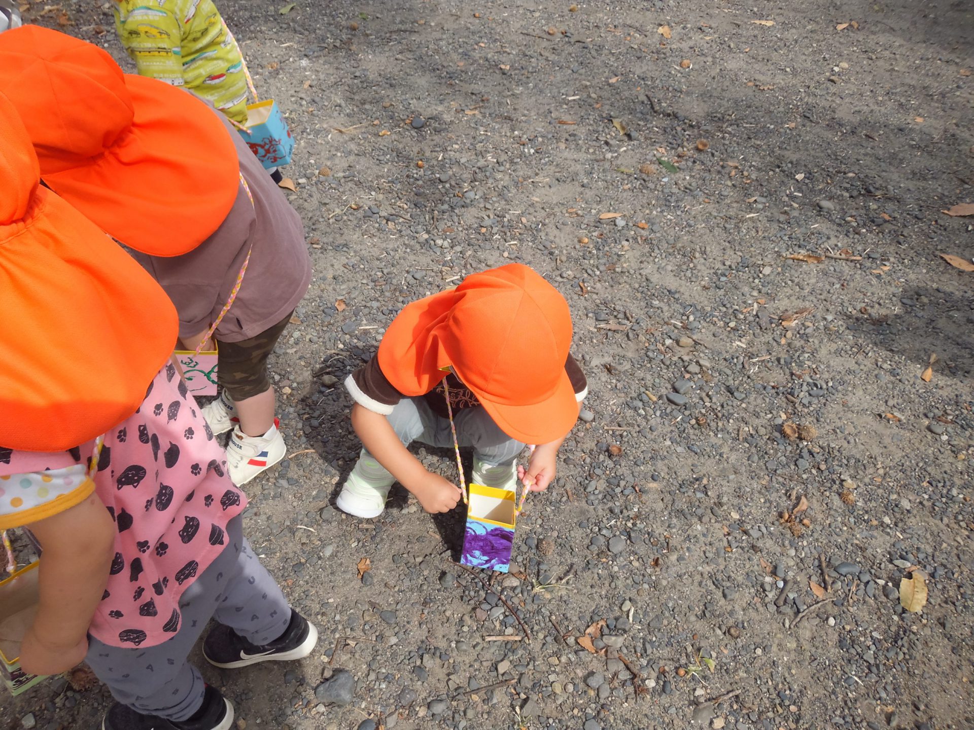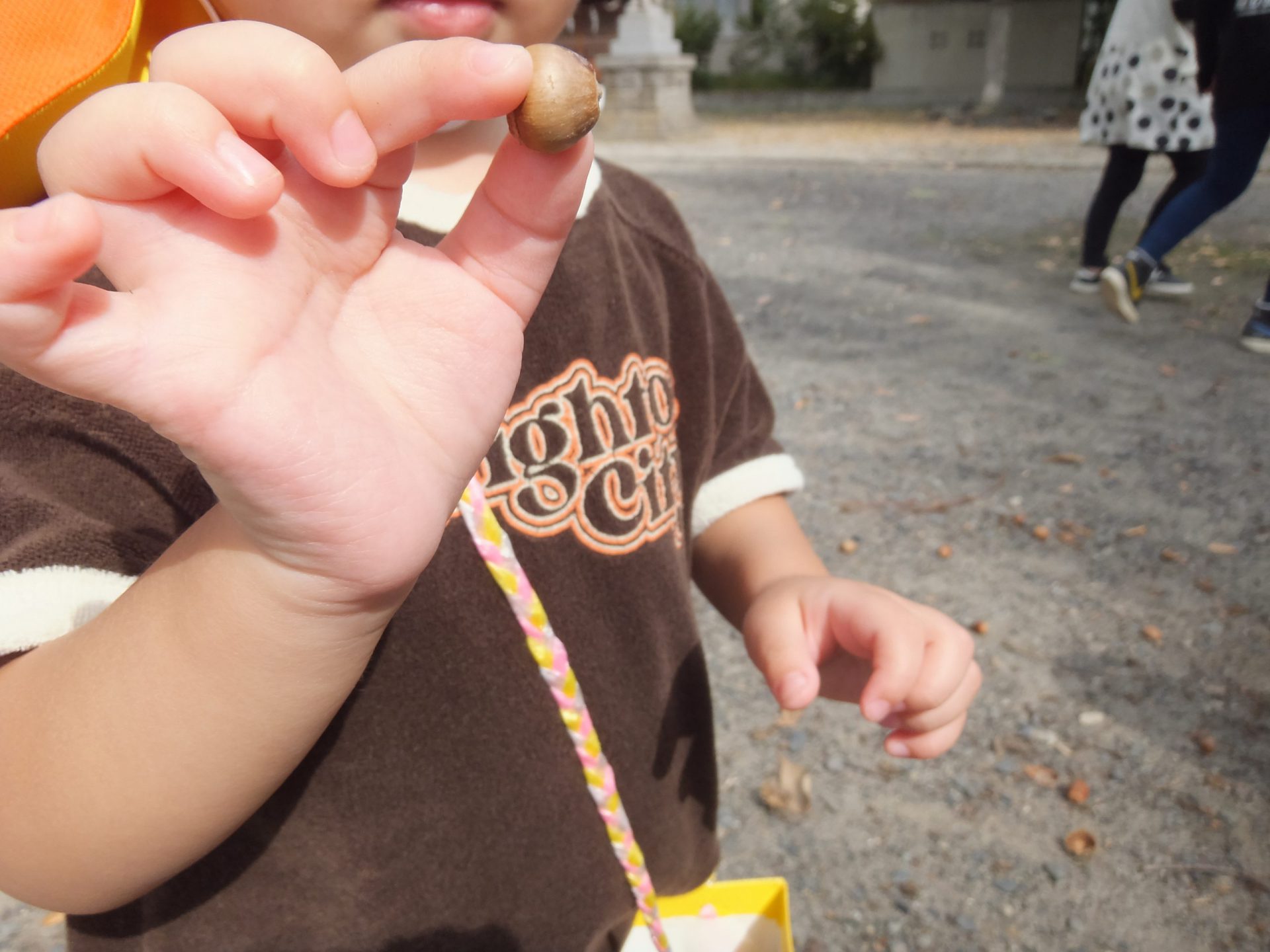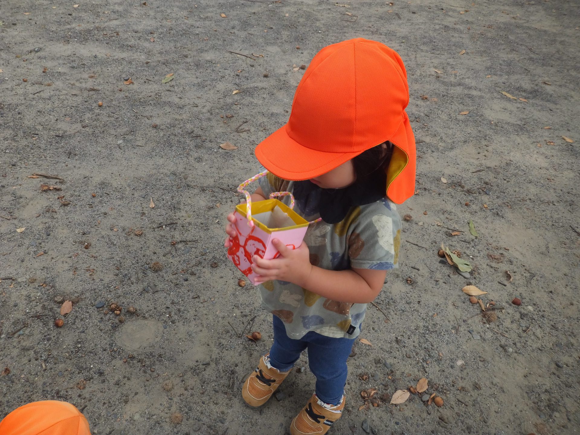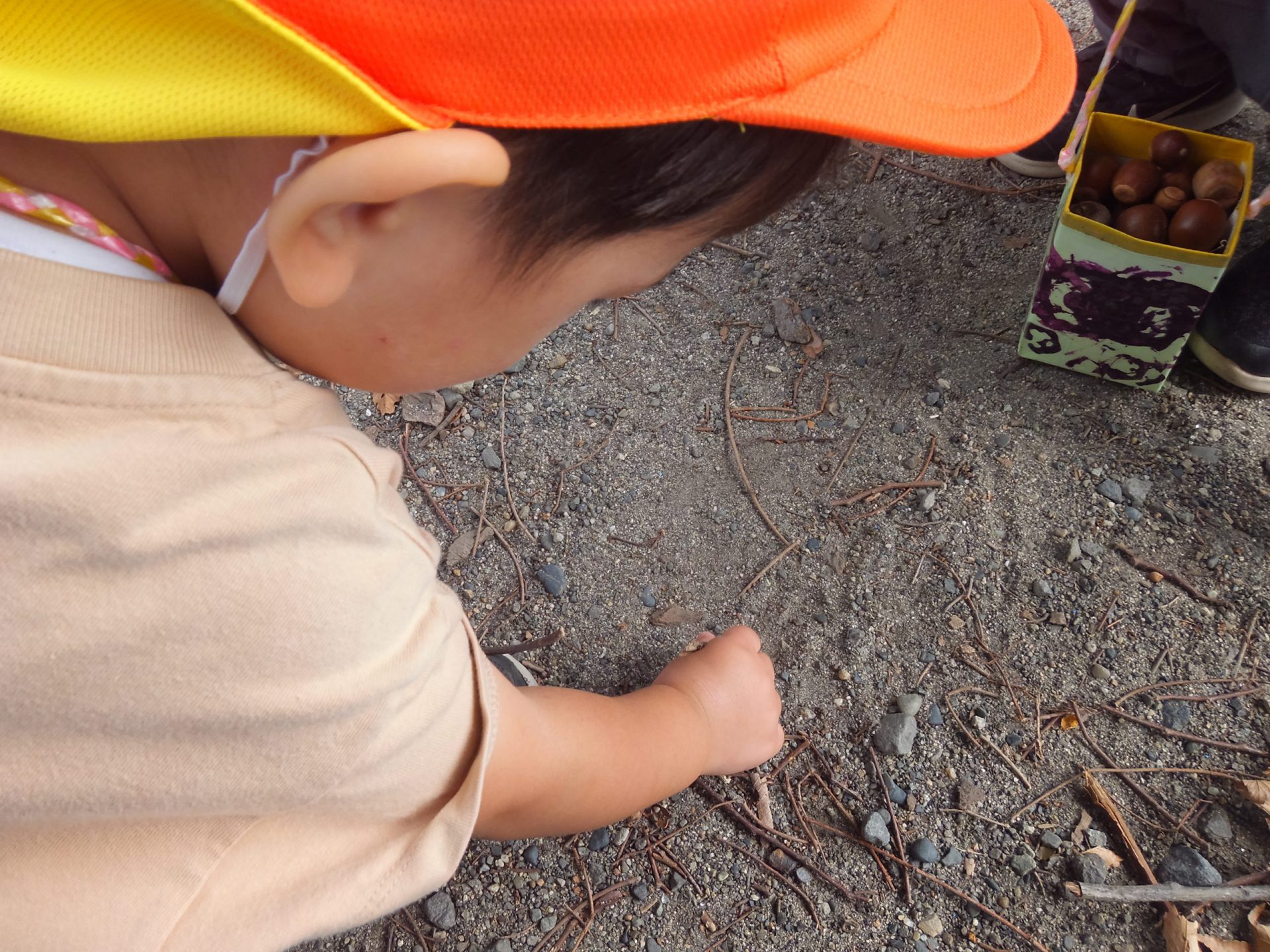 「あった!」どんぐりを見つけたA君。嬉しそうに、お散歩バックに入れます。