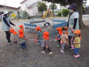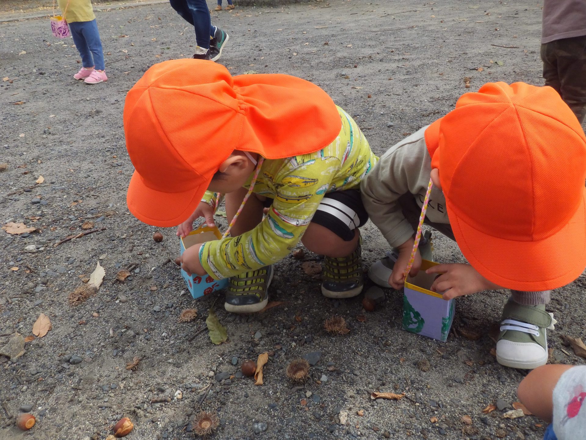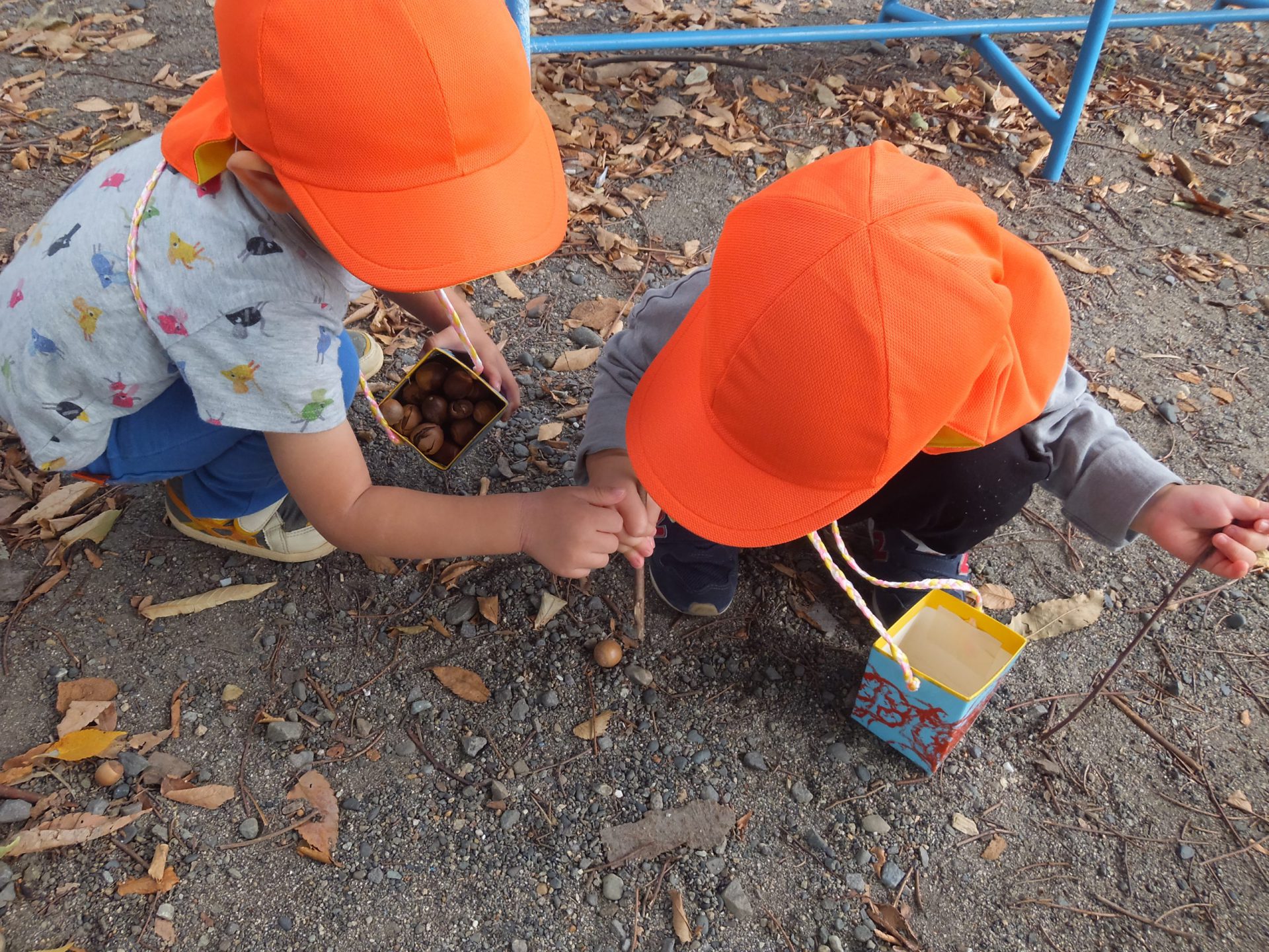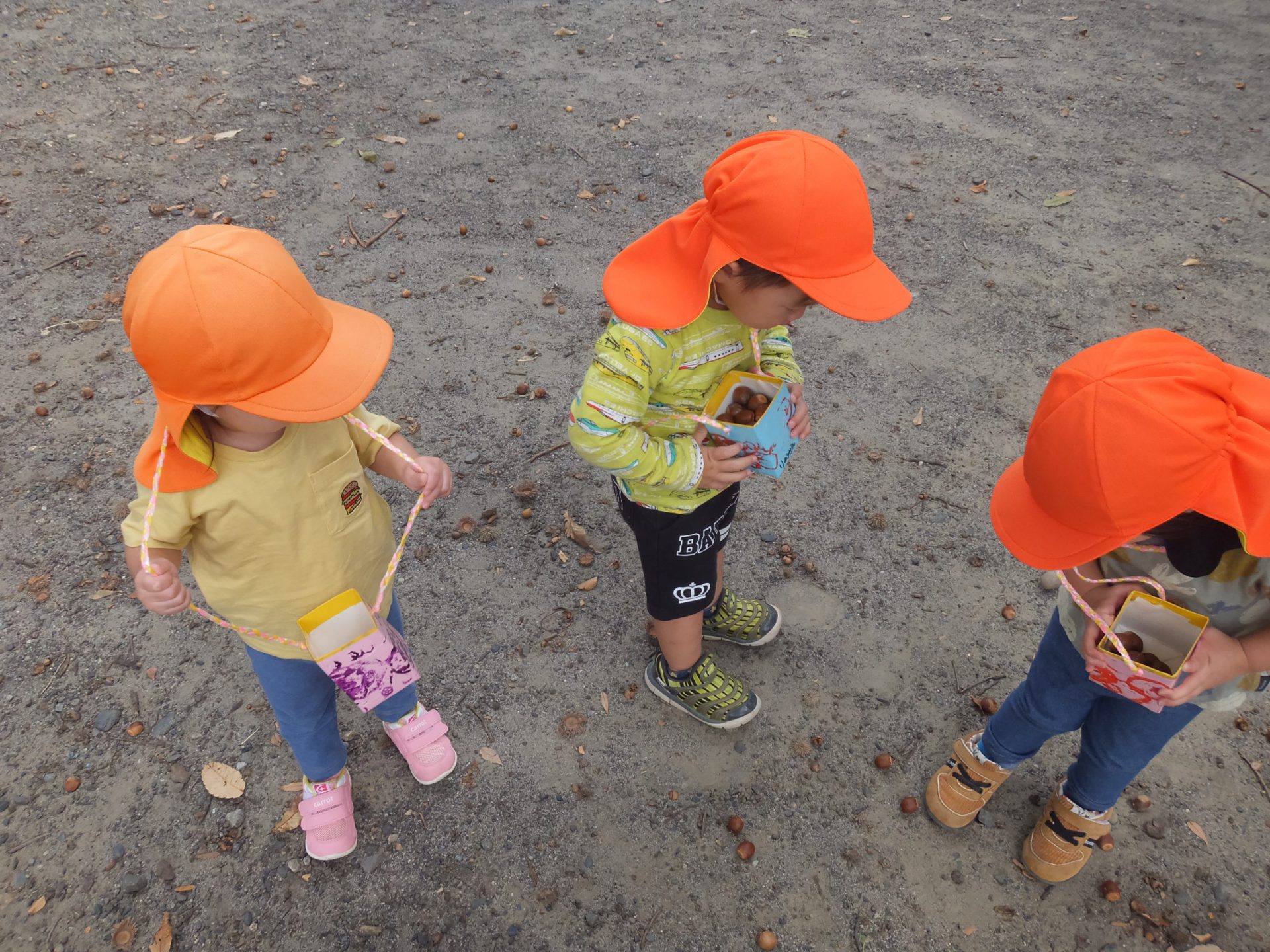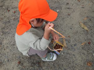 どんぐりをたくさん拾い集める子、小枝に興味を持つ子、探索を楽しむ子と様々でした。