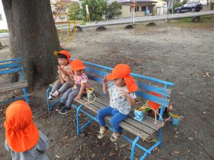 どんぐりで重くなったお散歩バックを置いて、ベンチでひと休み。