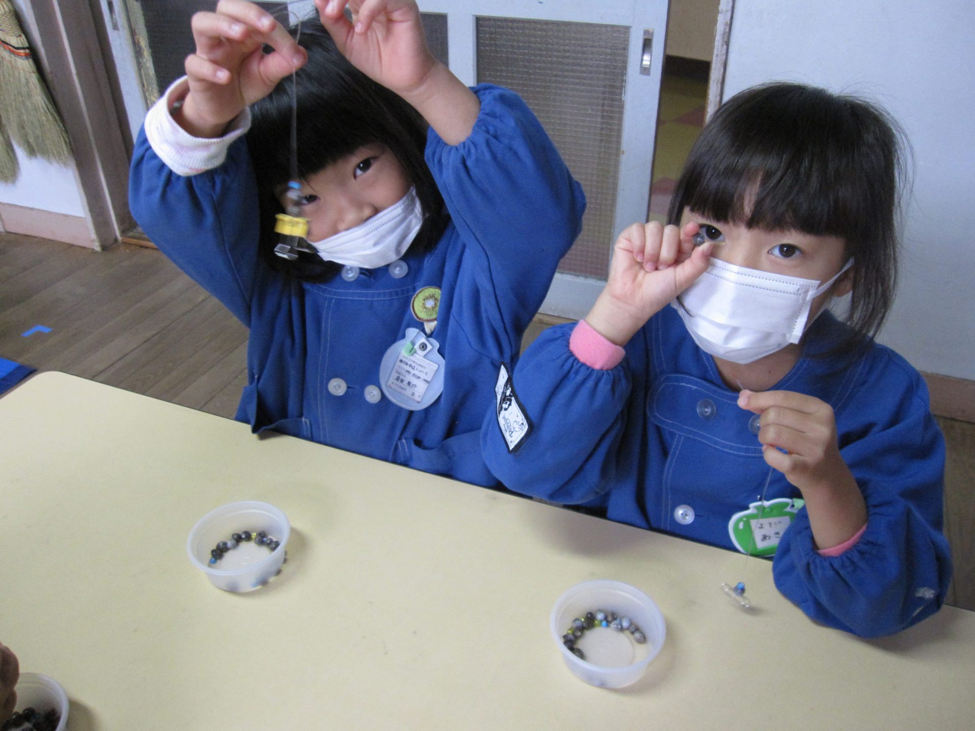 「みて!わたしはジュズダマを3つ入れて、ビーズを1つ入れるようにしたら、きれいにできたよ!」