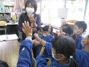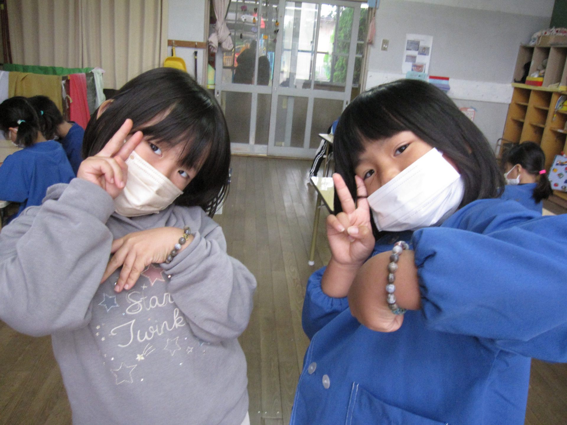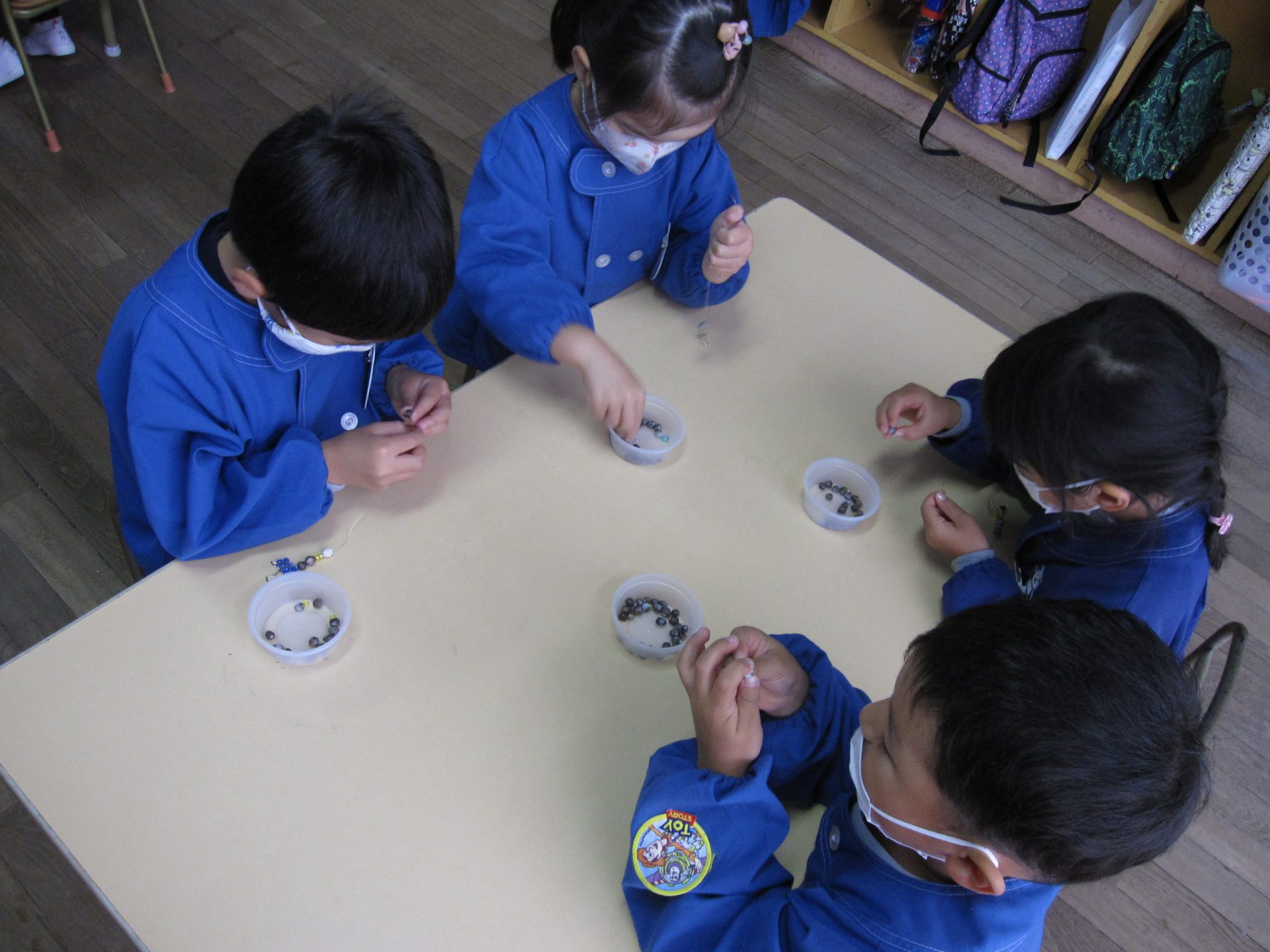 うでわ作りをきっかけに、育てたジュズダマがどんなものか観察したり、指先の使い方を試行錯誤したり、数字を意識したり、、、と様々な姿が見られました。また、できあがったものを腕につけ忍者になりきって戦ったり、違うクラスのお友達に見せに行き交流を楽しんだりとその後も遊びは広がっていきました。あいにくのお天気で中止になってしまった遠足でしたが、忍者のおかげで楽しい1日になりました!
